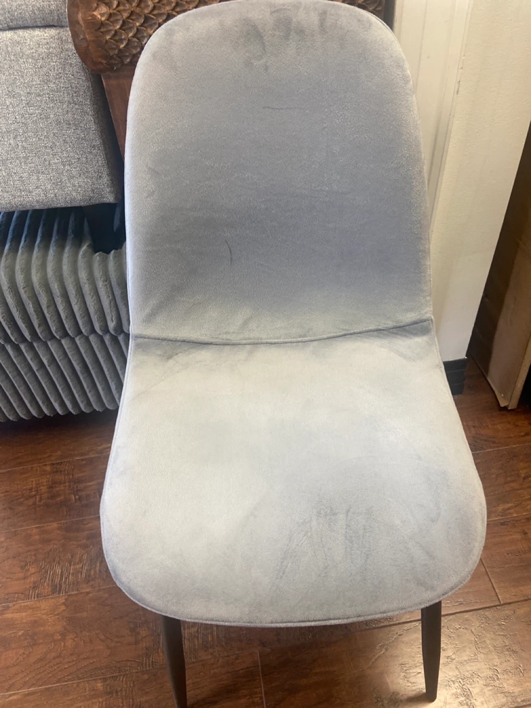 Selling a grey upholstered dining chair. It's in good condition and would be a great addition to any dining room or kitchen. The chair has a soft, comfortable seat and back, perfect for long dinners or gatherings with friends and family
