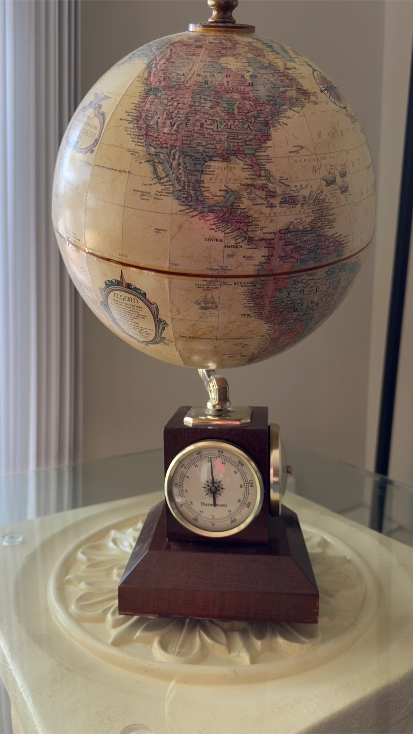 Selling a vintage Replogle globe that comes with a built-in thermometer! It's a unique piece that adds a touch of classic charm to any room. The globe itself is in good condition, showcasing detailed cartography. The thermometer appears to be functional, adding an extra layer of interest to this decorative item.