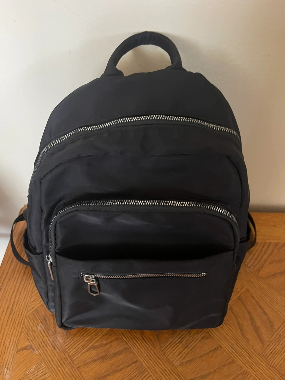 Selling a black backpack. It has a handle on top and adjustable straps. There are several zippered compartments to keep your belongings organized