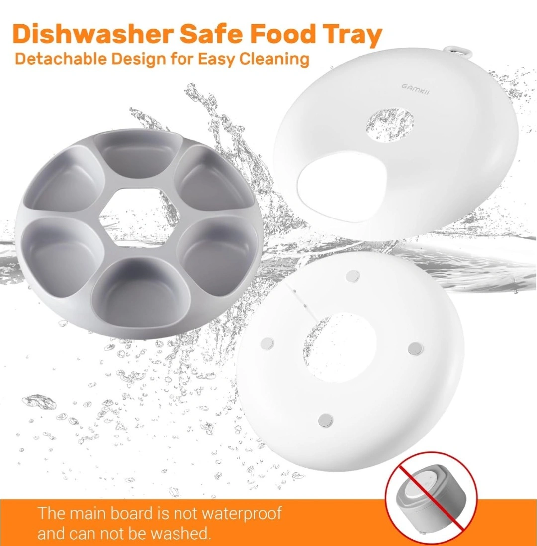 Selling a Gamkii automatic pet feeder! It's designed with a detachable food tray for easy cleaning. The feeder has a 3600mAh battery that lasts for 6-8 hours and provides up to 30 days of endurance time. It features 6 meal compartments and is suitable for both wet and dry food. Twin ice packs are included to keep the food fresh. The dimensions are 12.6" x 12.9" x 3.4".