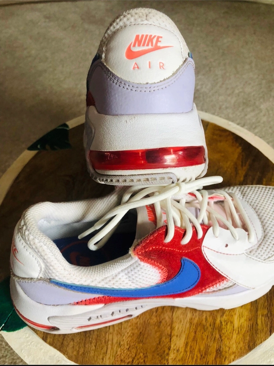 🥕ONLY $15!!! Selling a pair of Nike Air Max sneakers in US size 8! They're in good condition and ready for a new home. The vibrant red, white, and blue accents make them a standout choice for casual wear or workouts, Nice Clean, a little staining on the tongue where the red suade color bled, amazing price for a gently used shoe