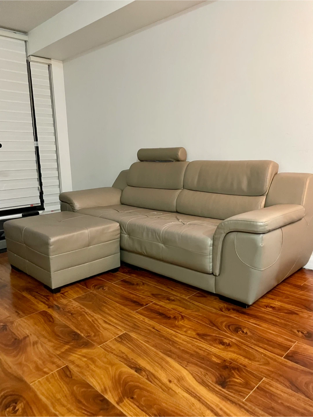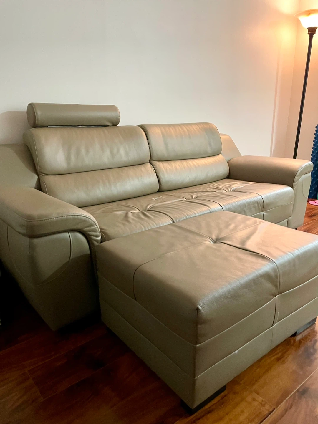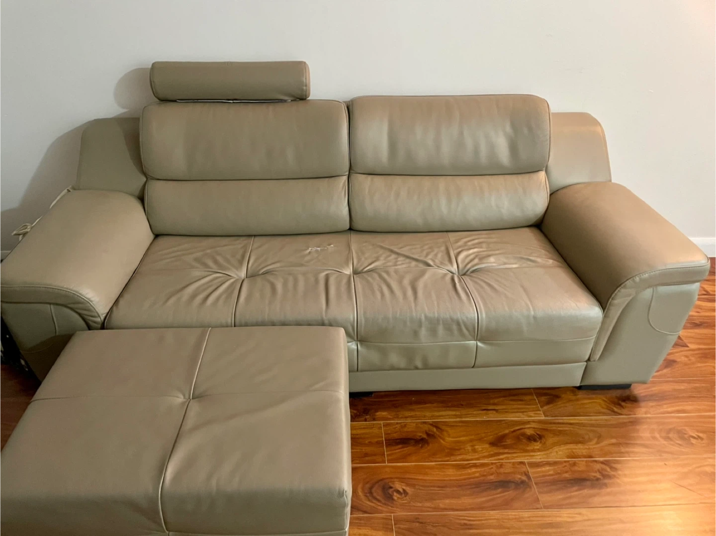 Selling a comfortable sofa with a matching ottoman. The sofa is in taupe beige and would be a great addition to any living room. There are some signs of use, but overall it's in good condition. Pick up only. There is a bit of a little tear, if you’re a handy, you could glue them? I had a sofa cover, and couldn’t tell. It’s a really good quality sofa.