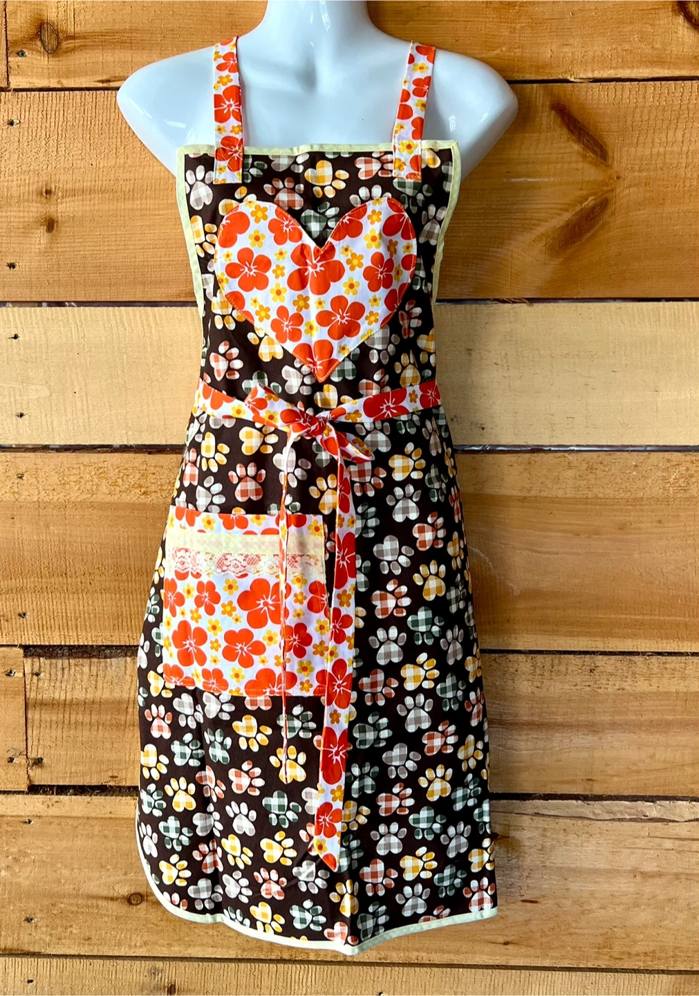 Super cute handmade apron with a floral heart and paw print pattern! It features a handy pocket and a tie waist. Perfect for baking or crafting!