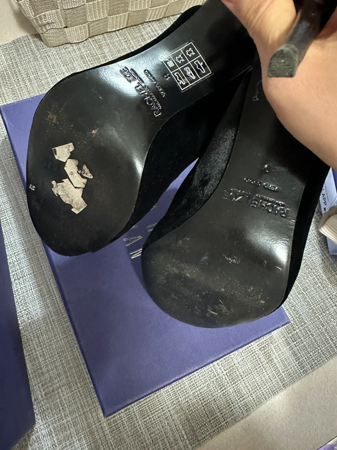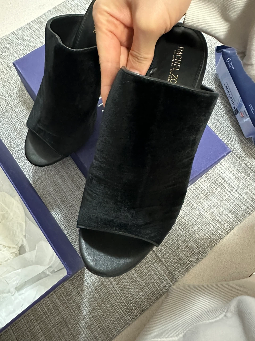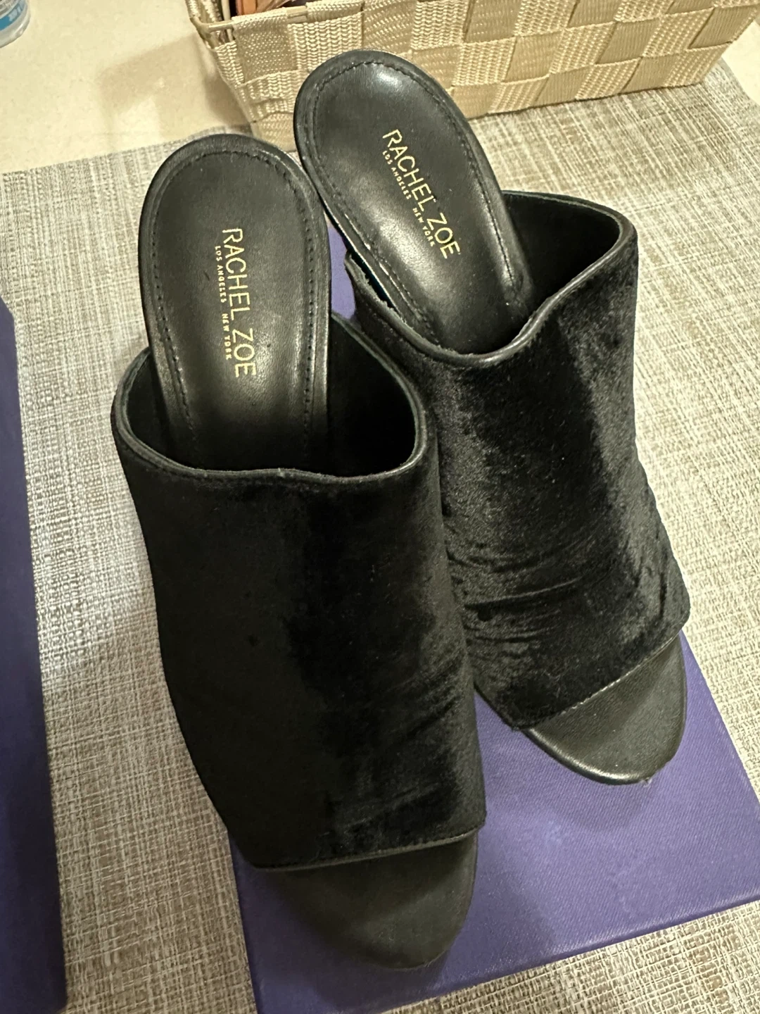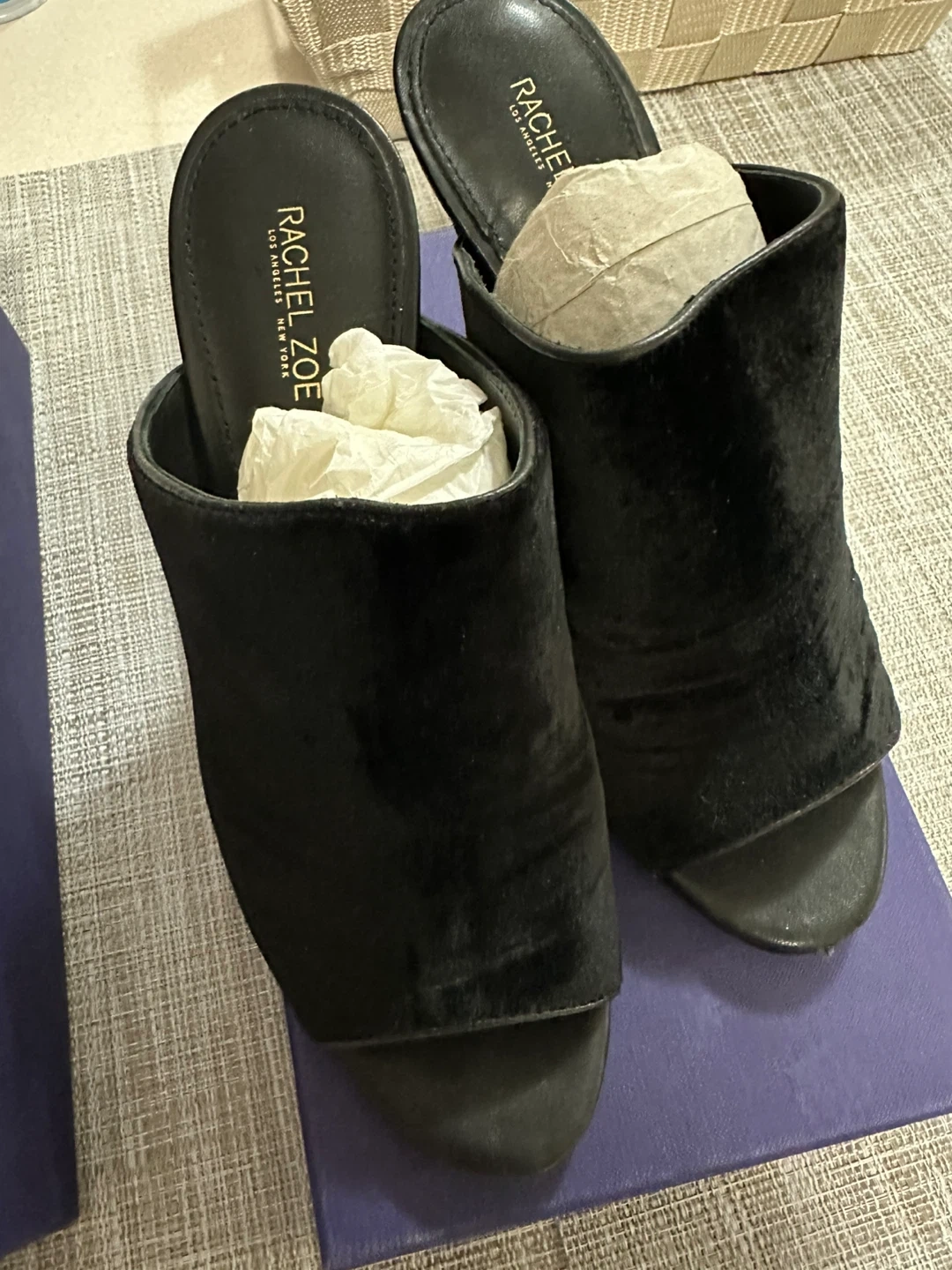 Selling a pair of Rachel Zoe black velvet heels in size 8- 8.5 These stylish heels are perfect for dressing up any outfit. There are some signs of wear on the soles, but overall they are in good condition wore them ONCE for gala. (Three hours) Heel was too much for me. Velvet suede would look really pretty with a black dress or jeans