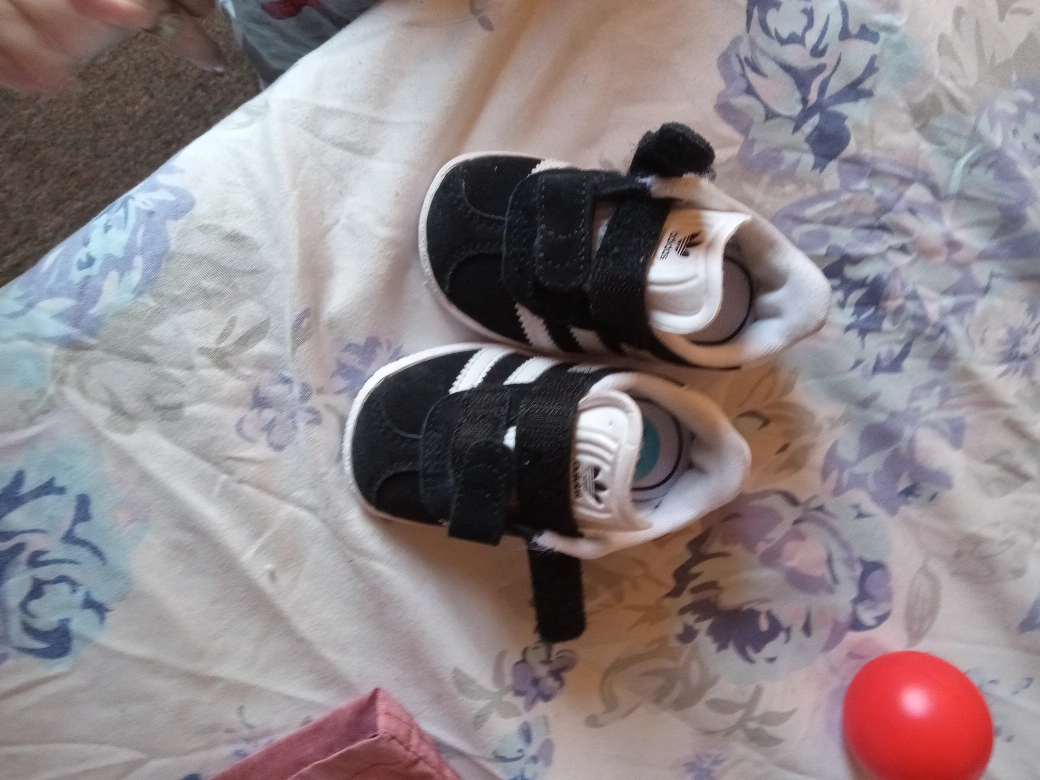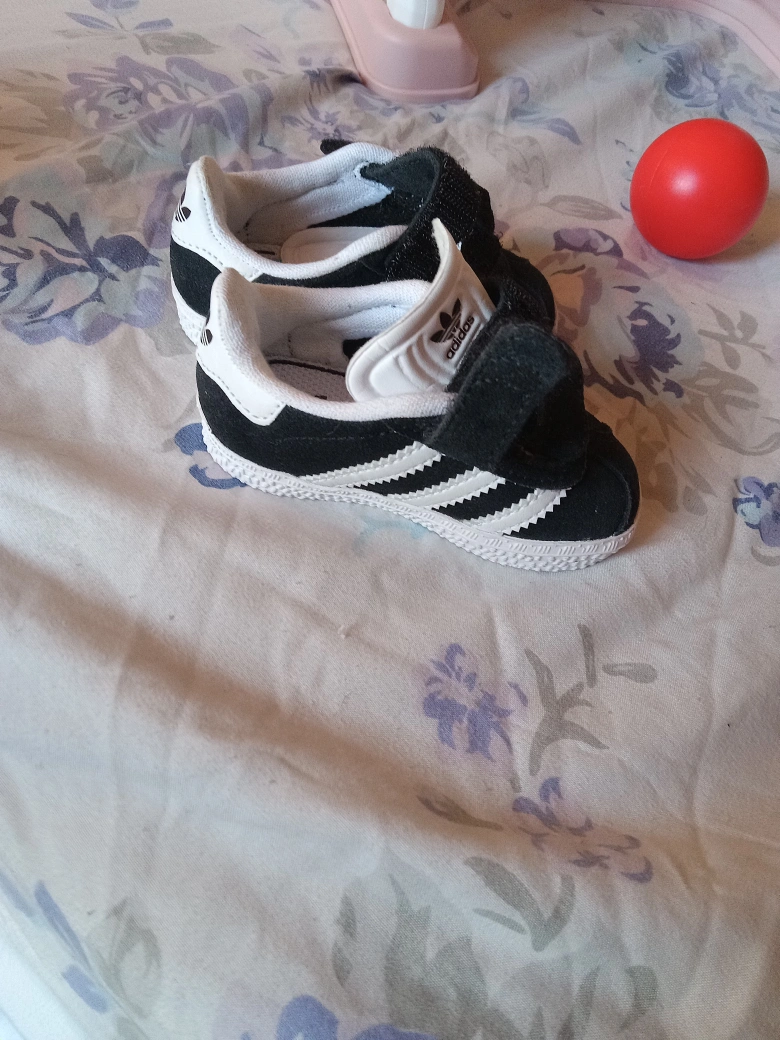 These adorable Adidas sneakers are perfect for your little one! They feature a classic black and white design with the iconic Adidas stripes. These shoes have velcro straps, making them easy to put on and take off. like new . size 4k
