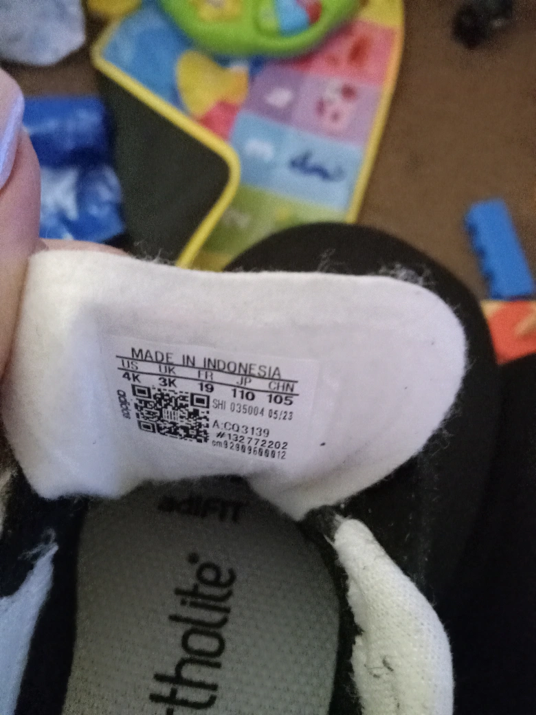 These adorable Adidas sneakers are perfect for your little one! They feature a classic black and white design with the iconic Adidas stripes. These shoes have velcro straps, making them easy to put on and take off. like new . size 4k