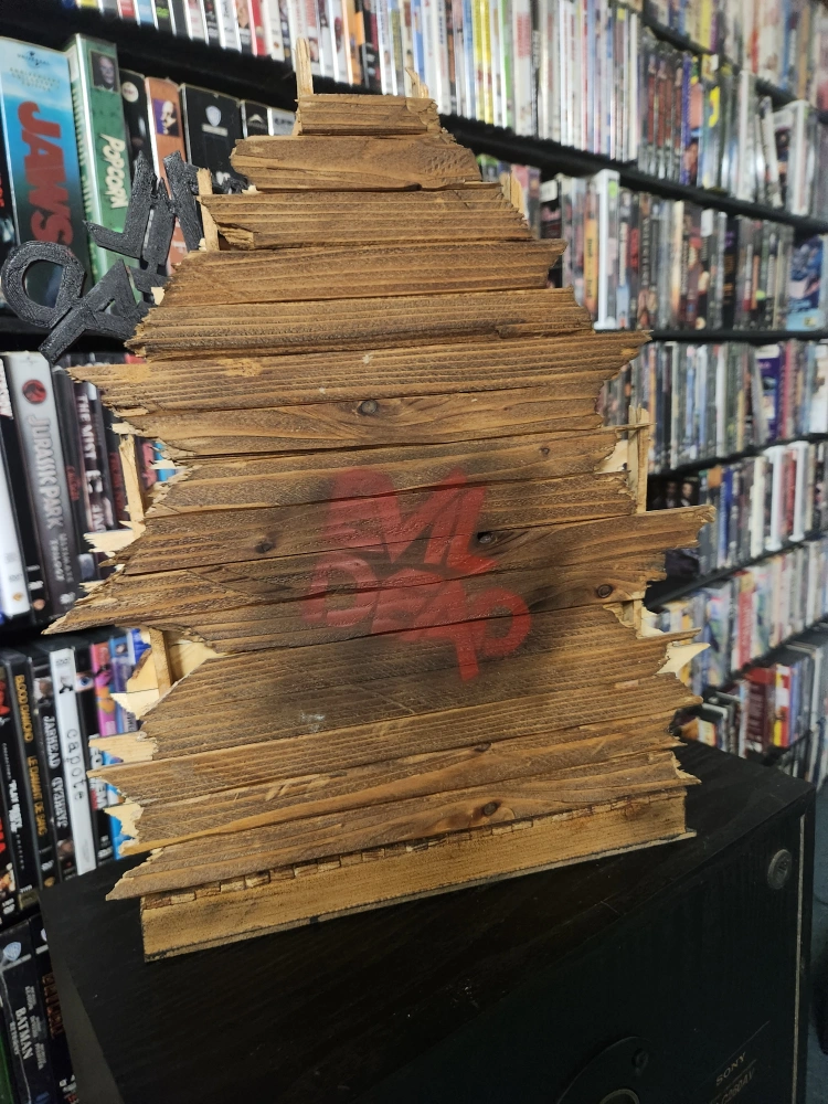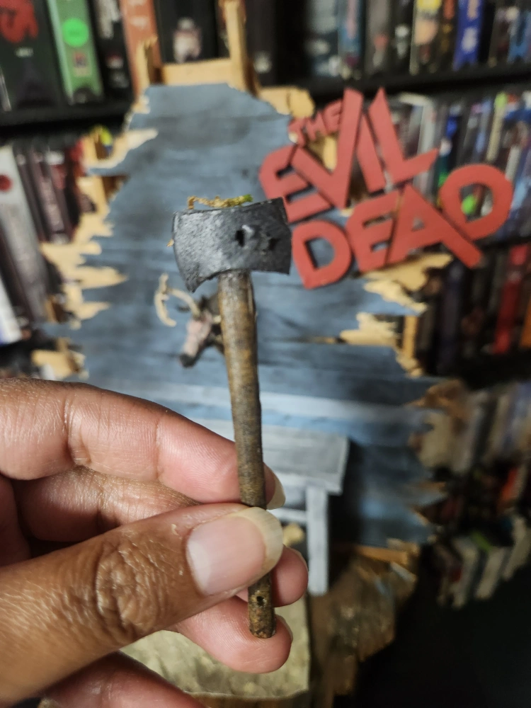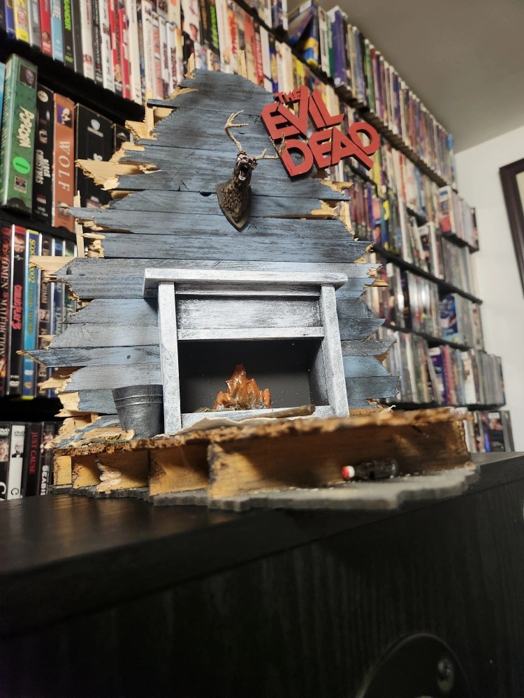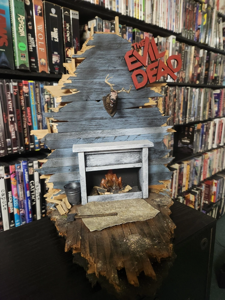 Here's a diorama inspired by "The Evil Dead"! It features a rustic cabin backdrop, a mounted deer head, and a small fireplace. A miniature axe and other details add to the spooky atmosphere, perfect for any horror fan or collector
