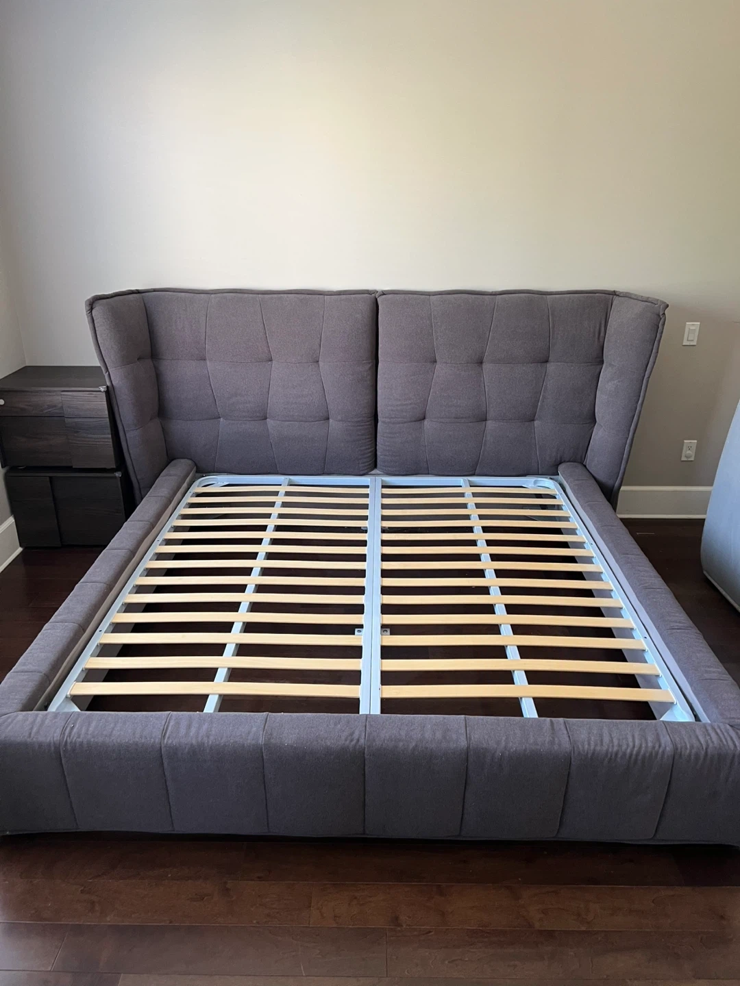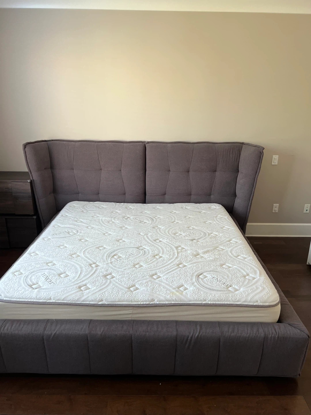 Modern charcoal grey king size bed with mattress. The bed is very solid and the condition is good. Smoke-free and pet-free home. The material is upholstered fabric.