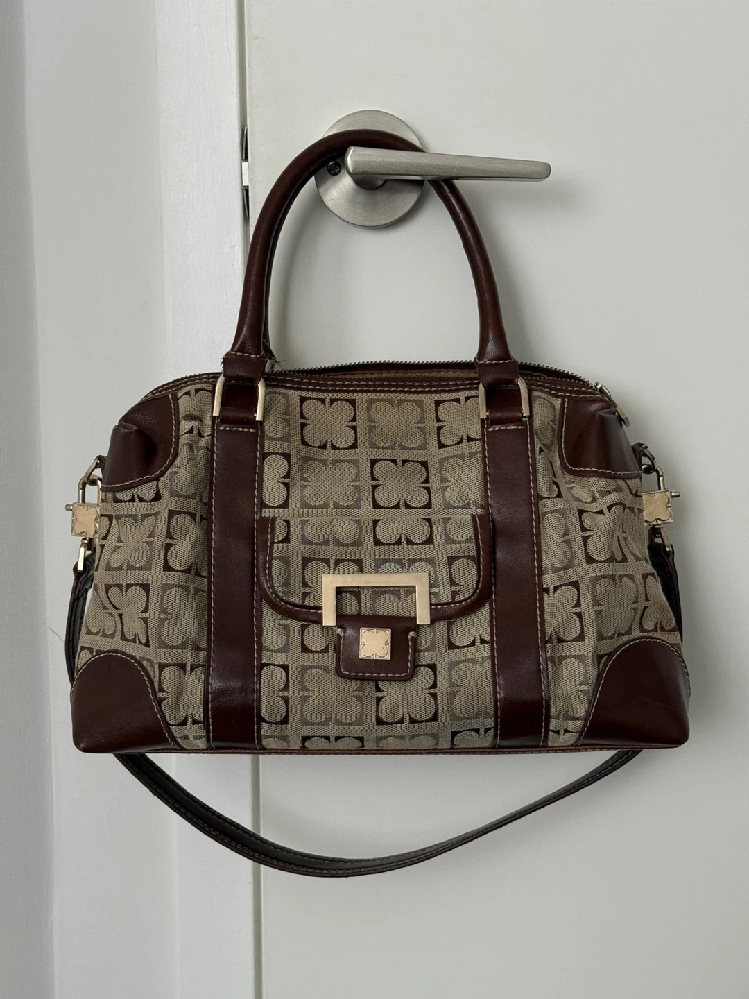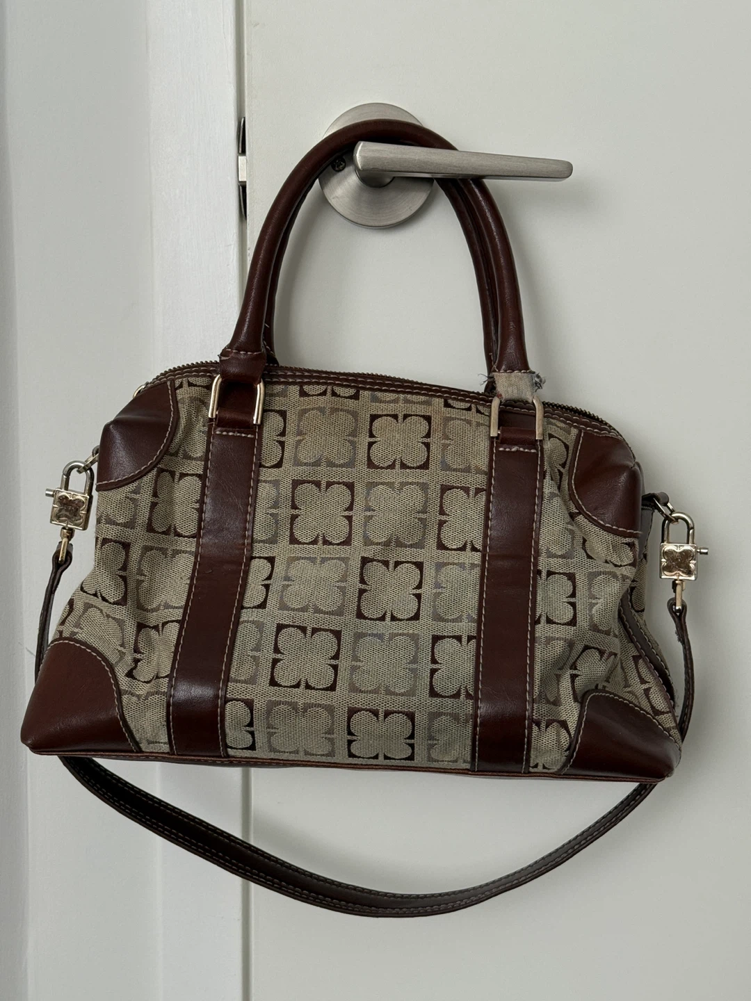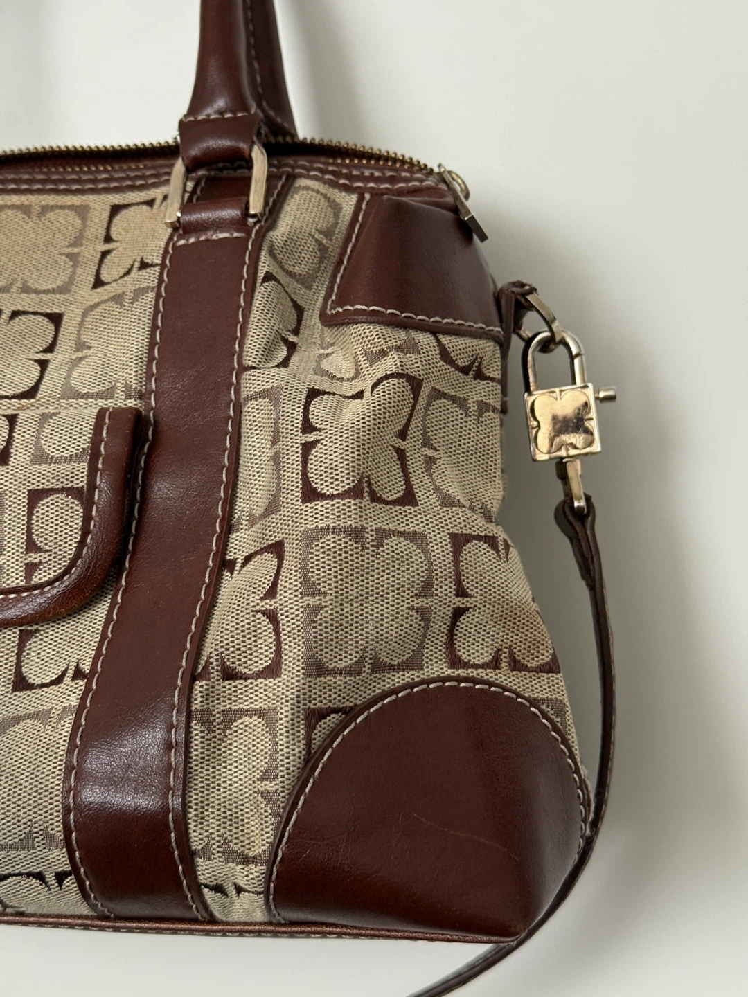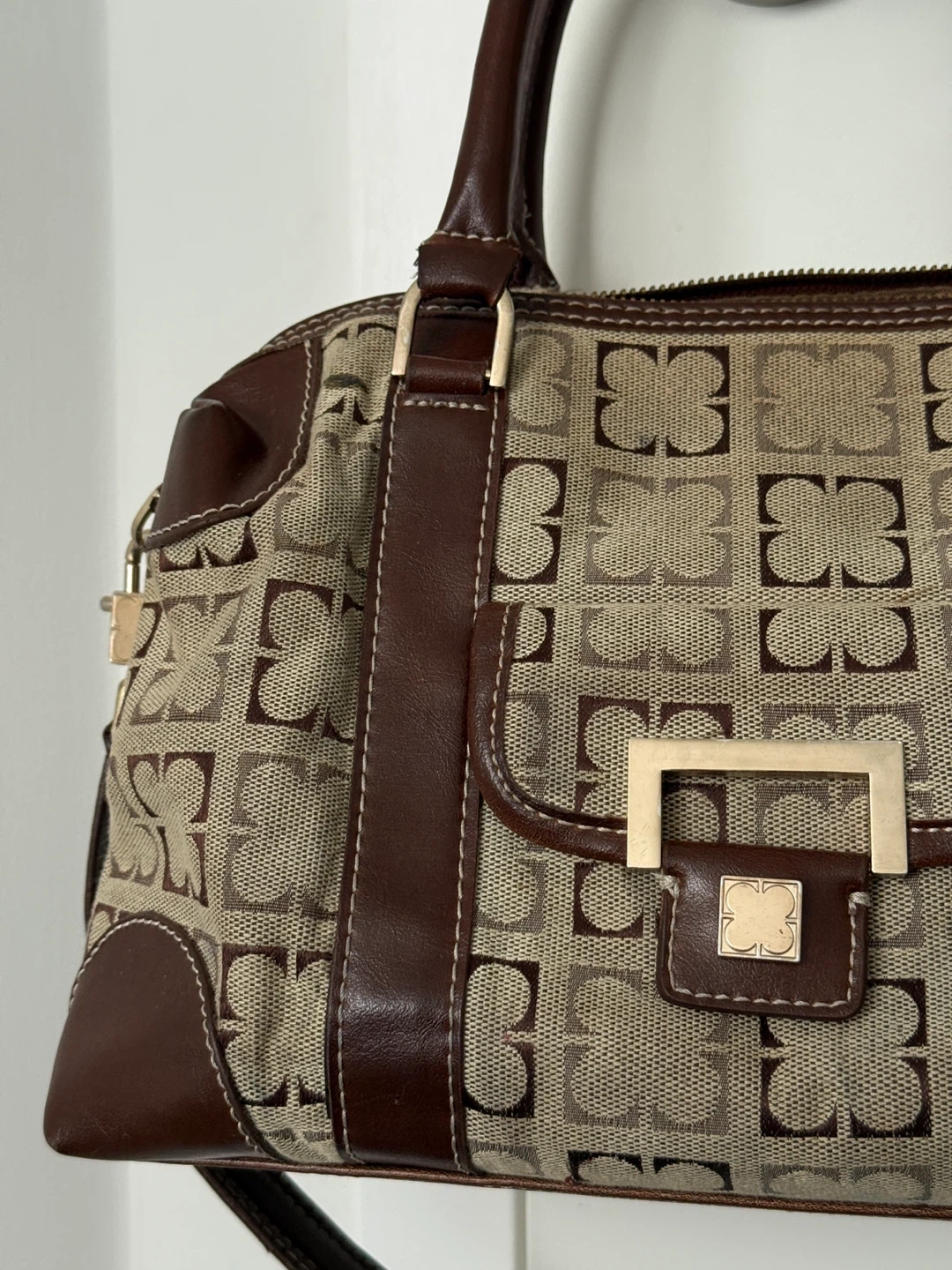 Selling a Liz Claiborne handbag with a unique brown and beige patterned design. It features brown leather accents and a lock with a key for added security. A stylish and functional addition to any wardrobe!