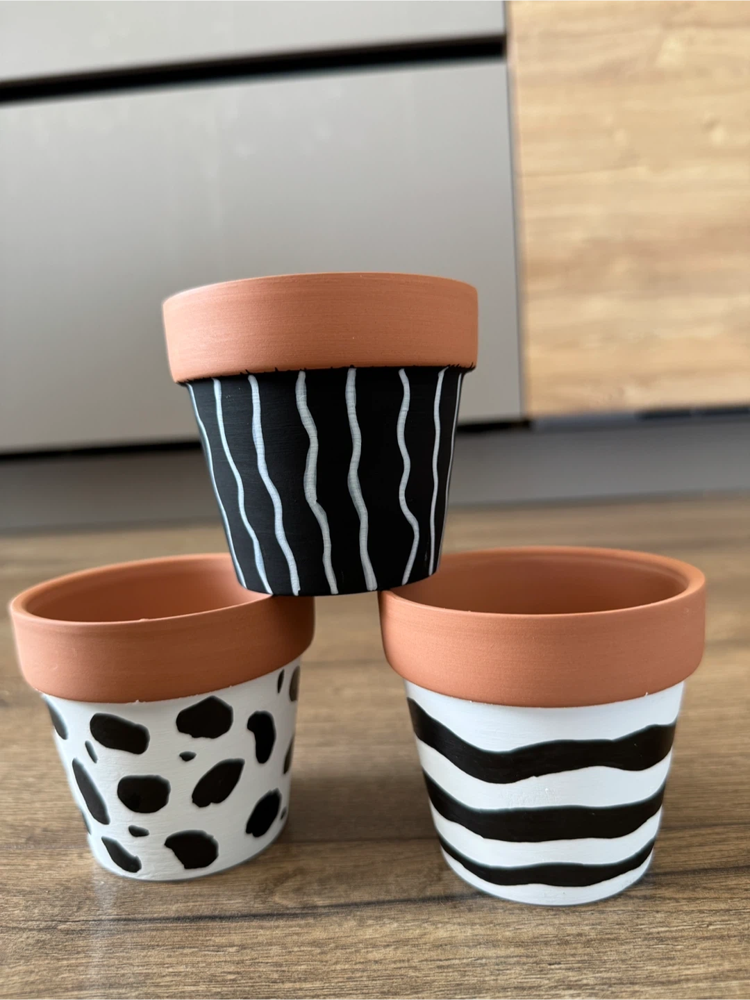 Selling a set of three hand-painted terracotta plant pots!They each have a unique black and white design: one with zebra stripes, one with cow spots, and one with wavy lines. The terracotta plant posts come with a set of three artificial plants. Perfect for adding a bit of fun to your indoor plants! Brand new ! Comes from a clean home pets free & smoke free
