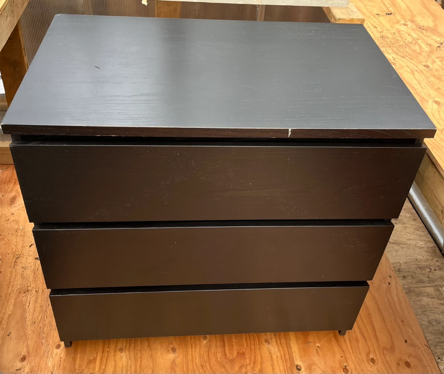Selling a black dresser with three drawers, perfect for extra storage in any room. It's in good condition and ready for a new home. One minor scratch on top.
