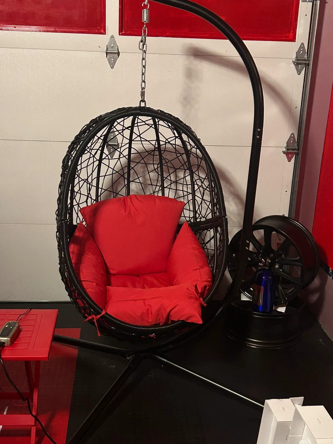 60Selling a hanging egg chair with a stand. It comes with a comfy red cushion. This chair is perfect for relaxing indoors or outdoors. It's in great condition and ready for a new home!
