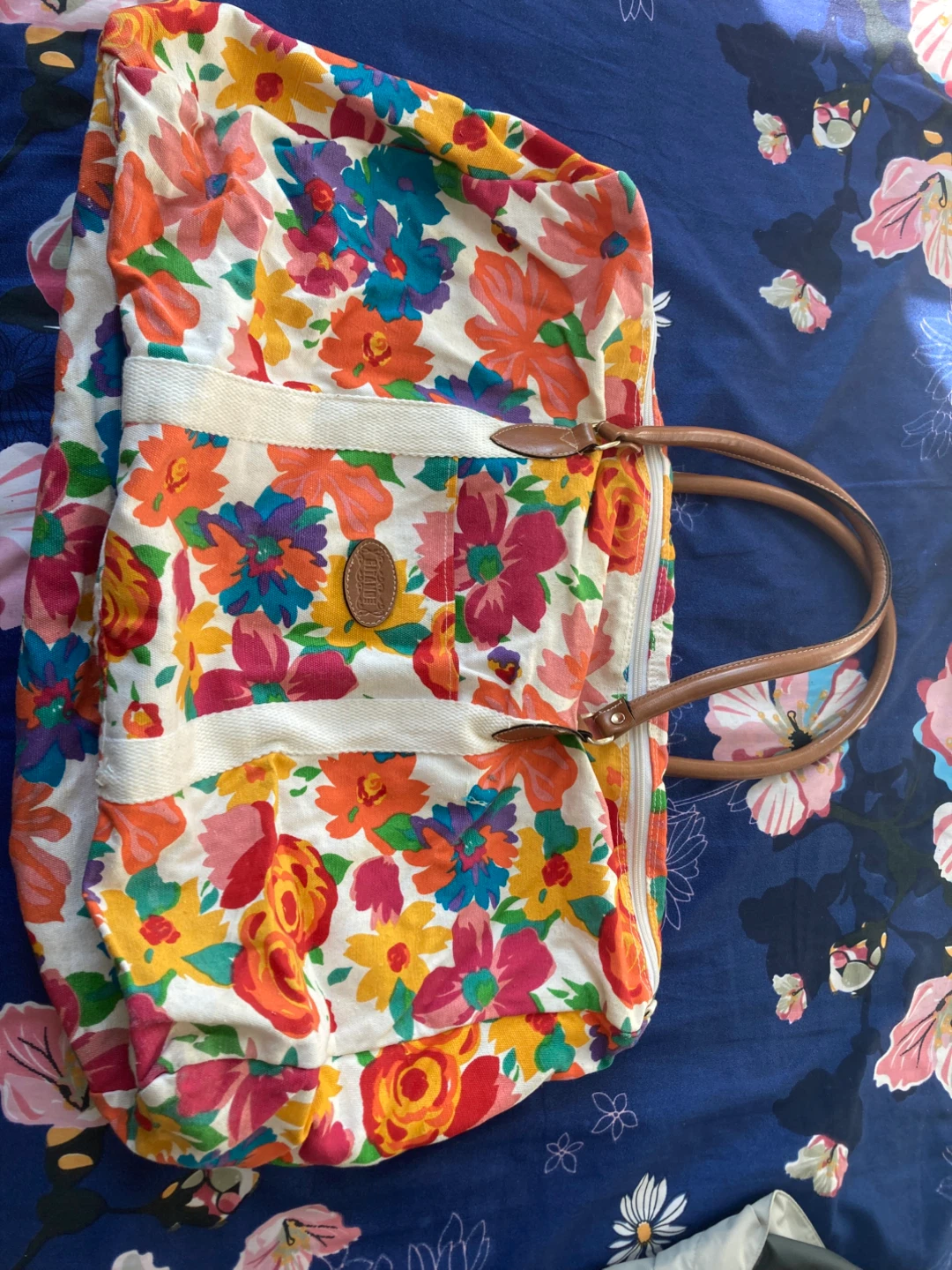 Here's a cute tote bag with a vibrant floral pattern! It's perfect for carrying your essentials in style. The bag features sturdy brown handles and a convenient pocket on the front. It's in great condition and ready for a new home