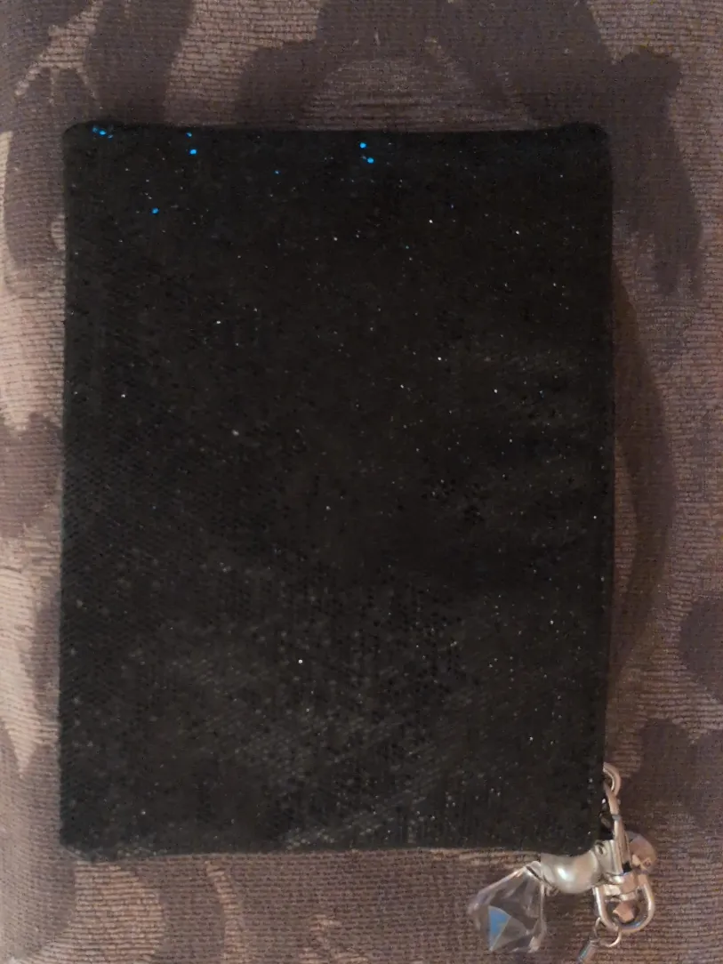 A cute black clutch with a glittery finish! It has a small clasp and a decorative charm. Perfect for a night out or special occasion