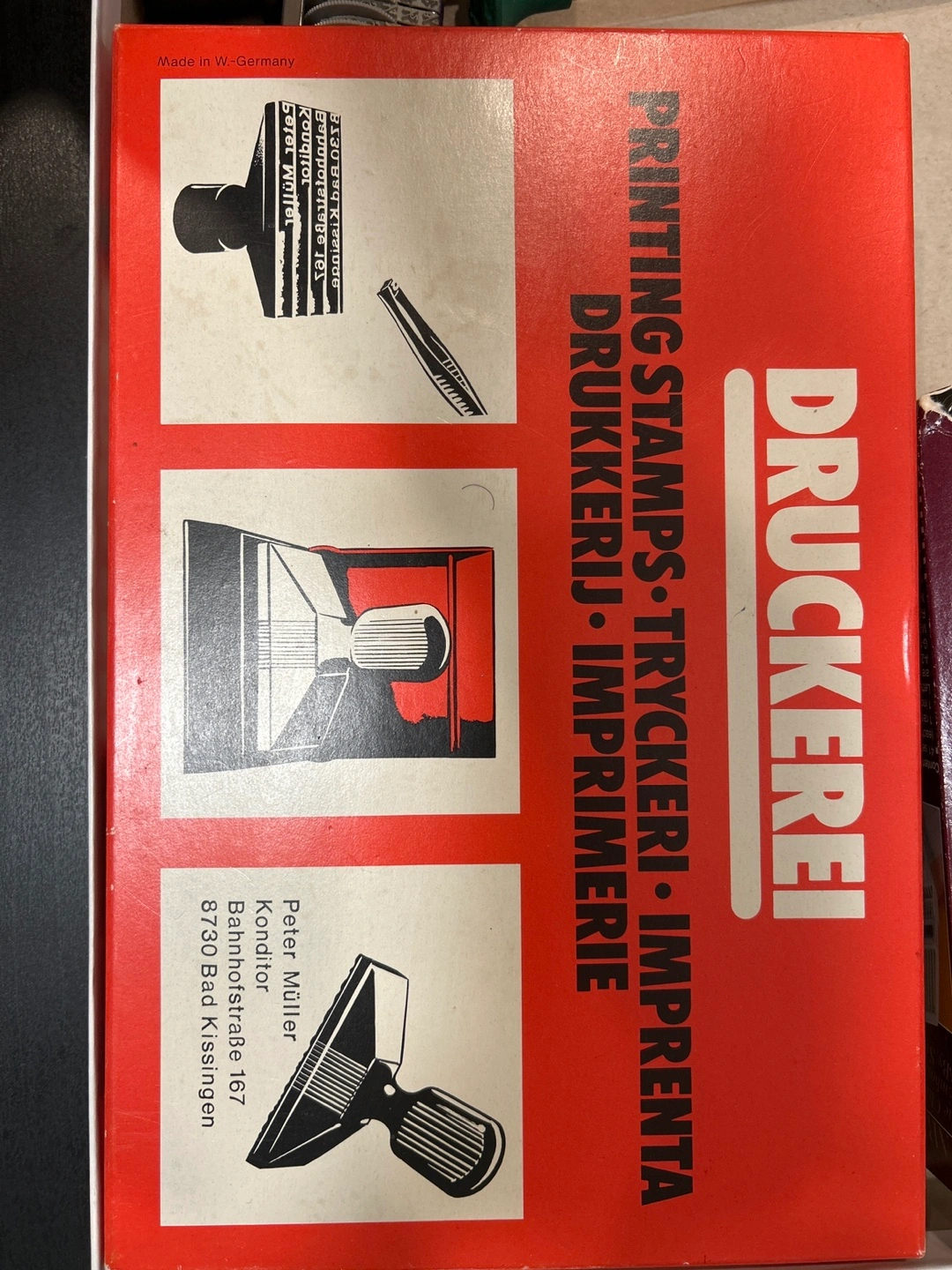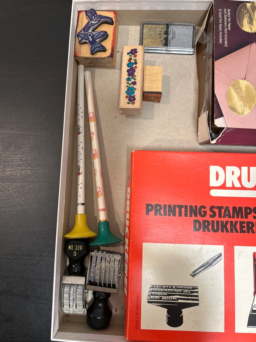This is The Mark III Changeable Initials Embossing Kit by Sue Hill. It's for monograms for family and friends. Includes a selection of stamps and an ink box. Some gold foil seals are also included.