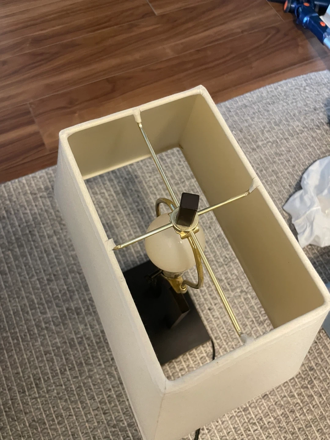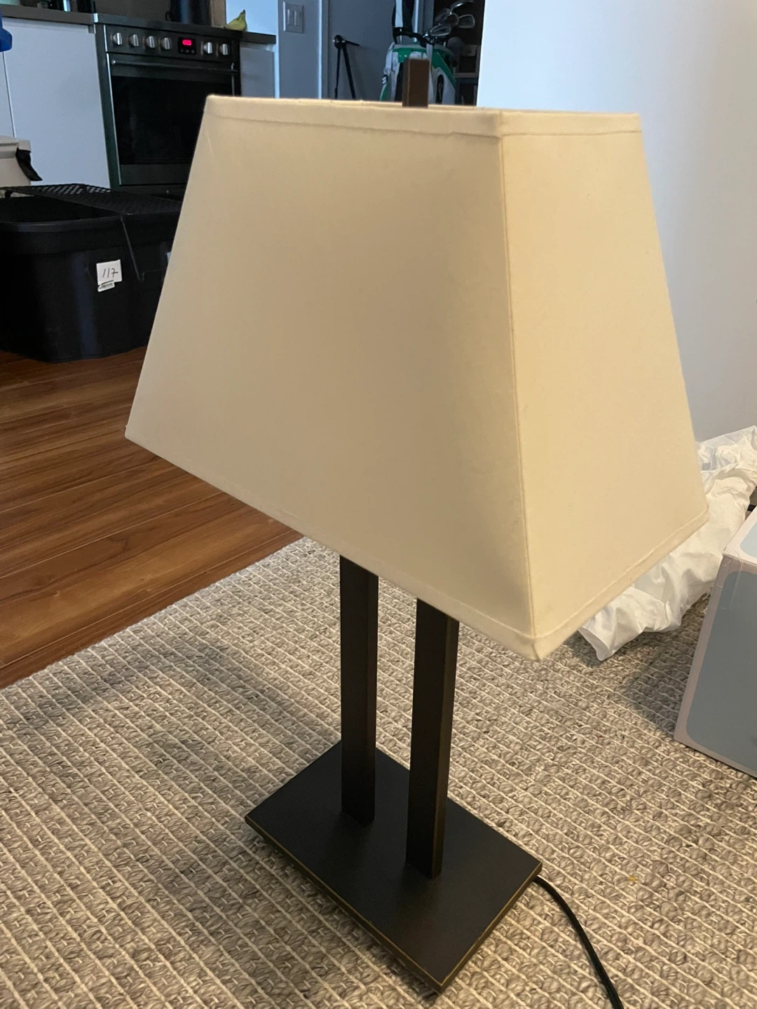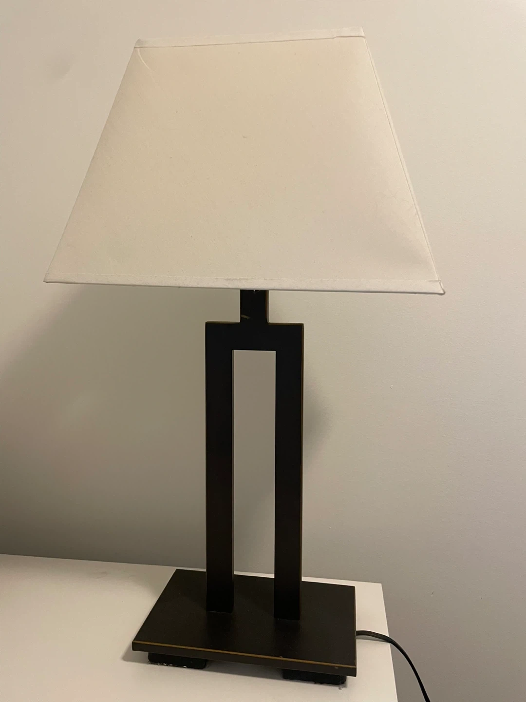 This modern table lamp features a rectangular ivory shade and a dark metal base. It's a stylish addition to any room. Perfect for ambient lighting or as a reading lamp.