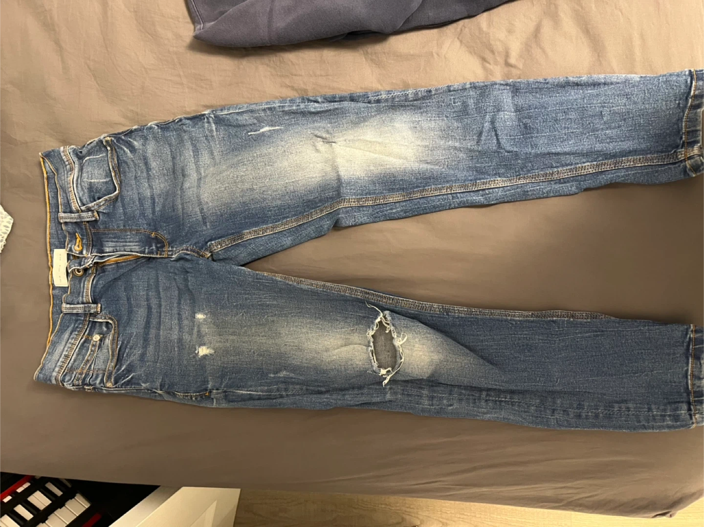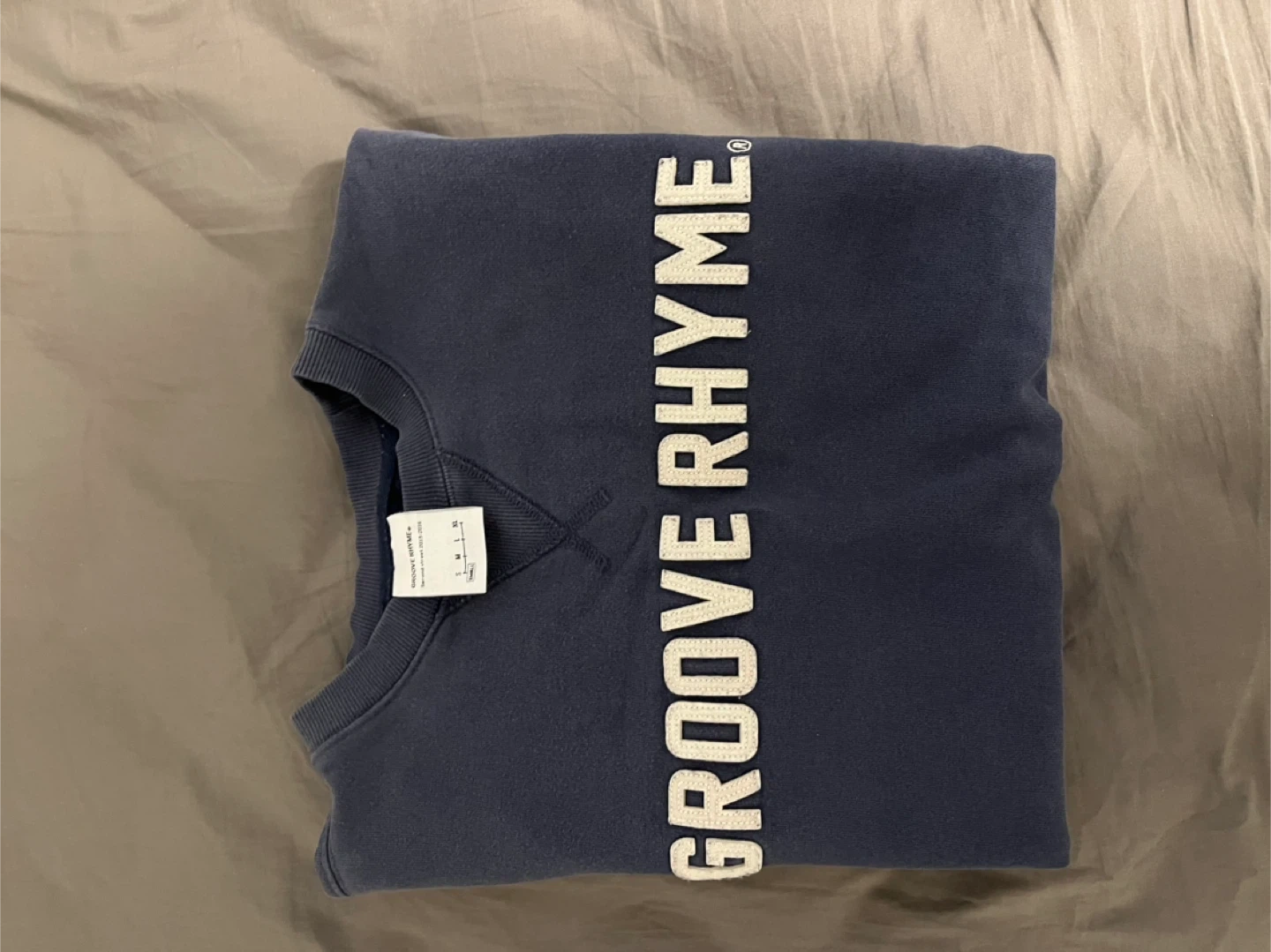 This is a blue sweatshirt with "GROOVE RHYME" printed vertically on the front. It's a crewneck style with ribbed cuffs and hem. This would be a comfy addition to casual wear!