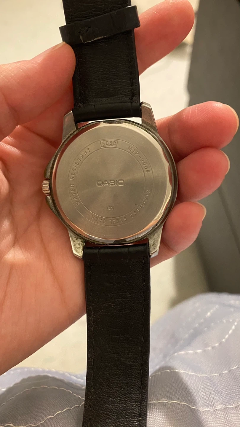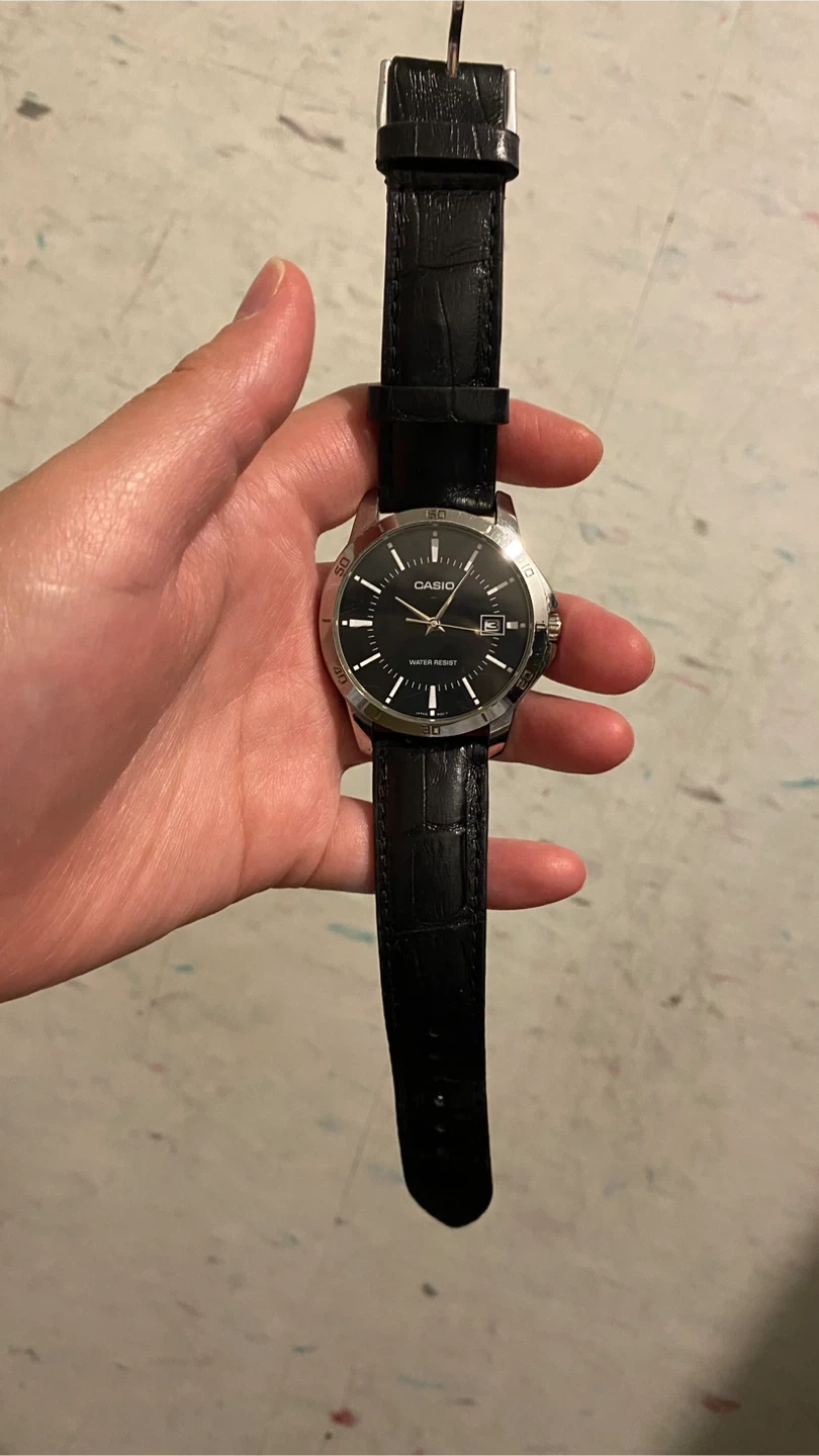 Selling a classic Casio watch with a sleek black dial and a comfortable black leather strap. It's a stylish and reliable timepiece for everyday wear. The model number is MTP-V004. It's in great condition and ready for a new wrist!
