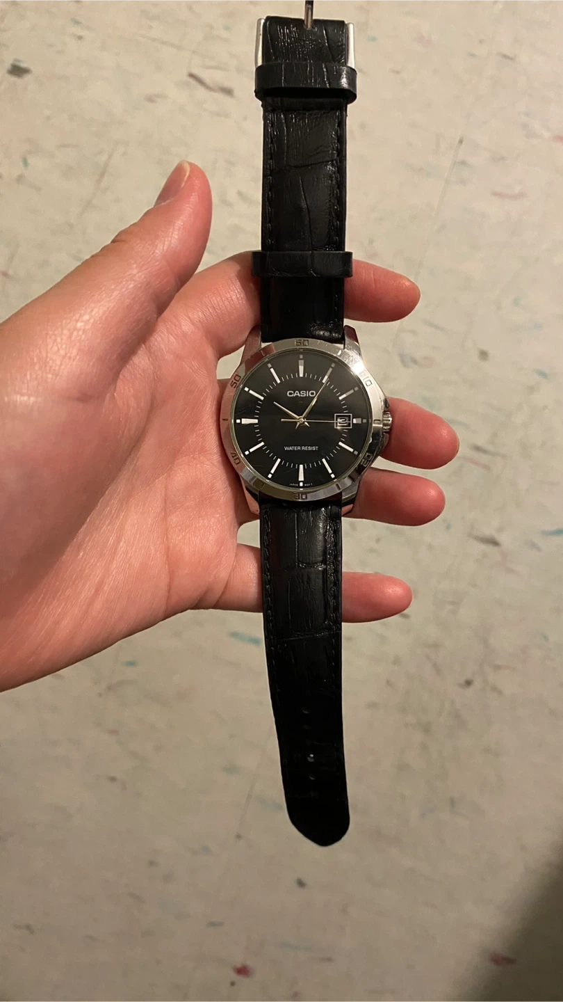 Selling a classic Casio watch with a sleek black dial and a comfortable black leather strap. It's a stylish and reliable timepiece for everyday wear. The model number is MTP-V004. It's in great condition and ready for a new wrist!