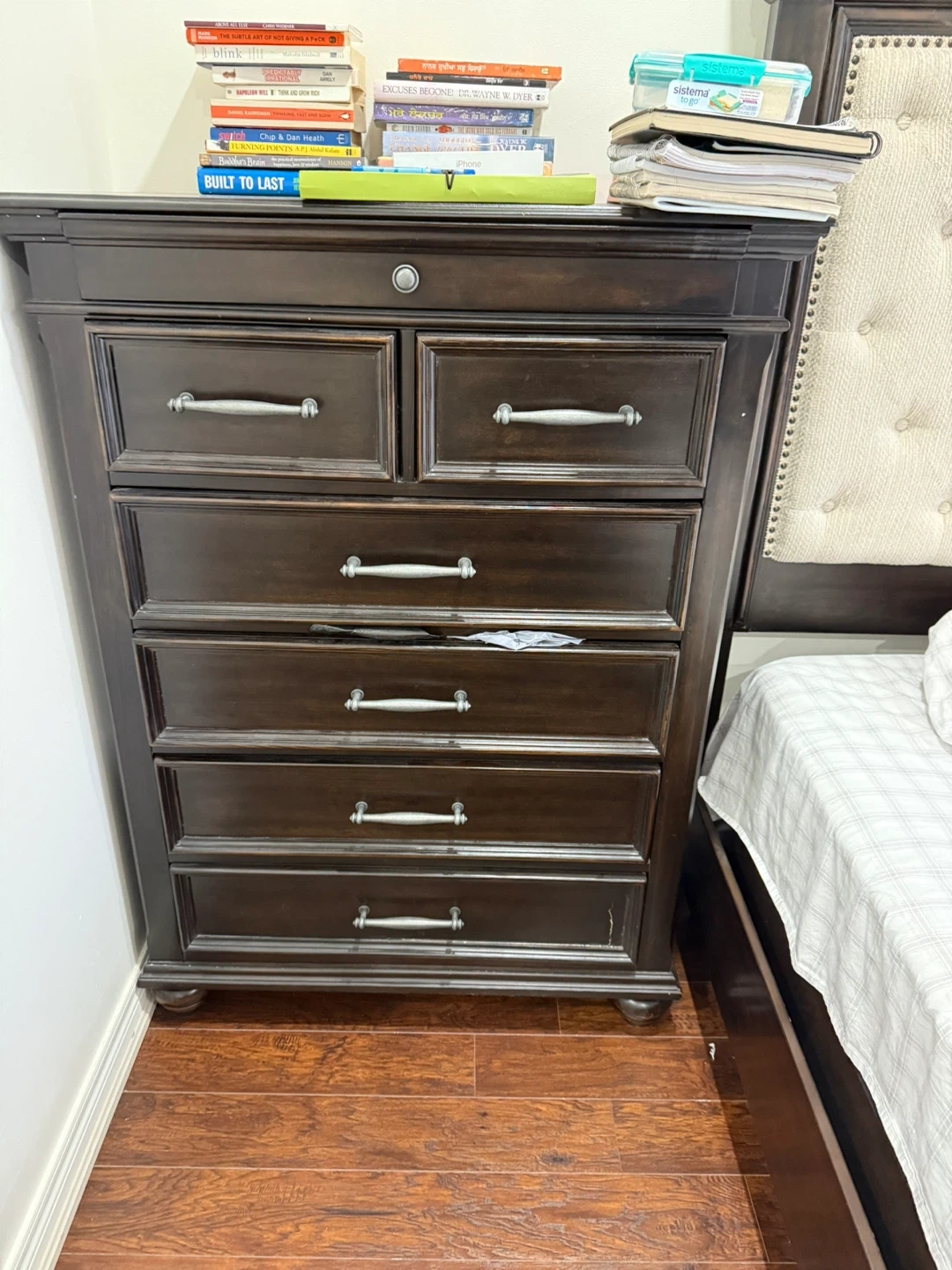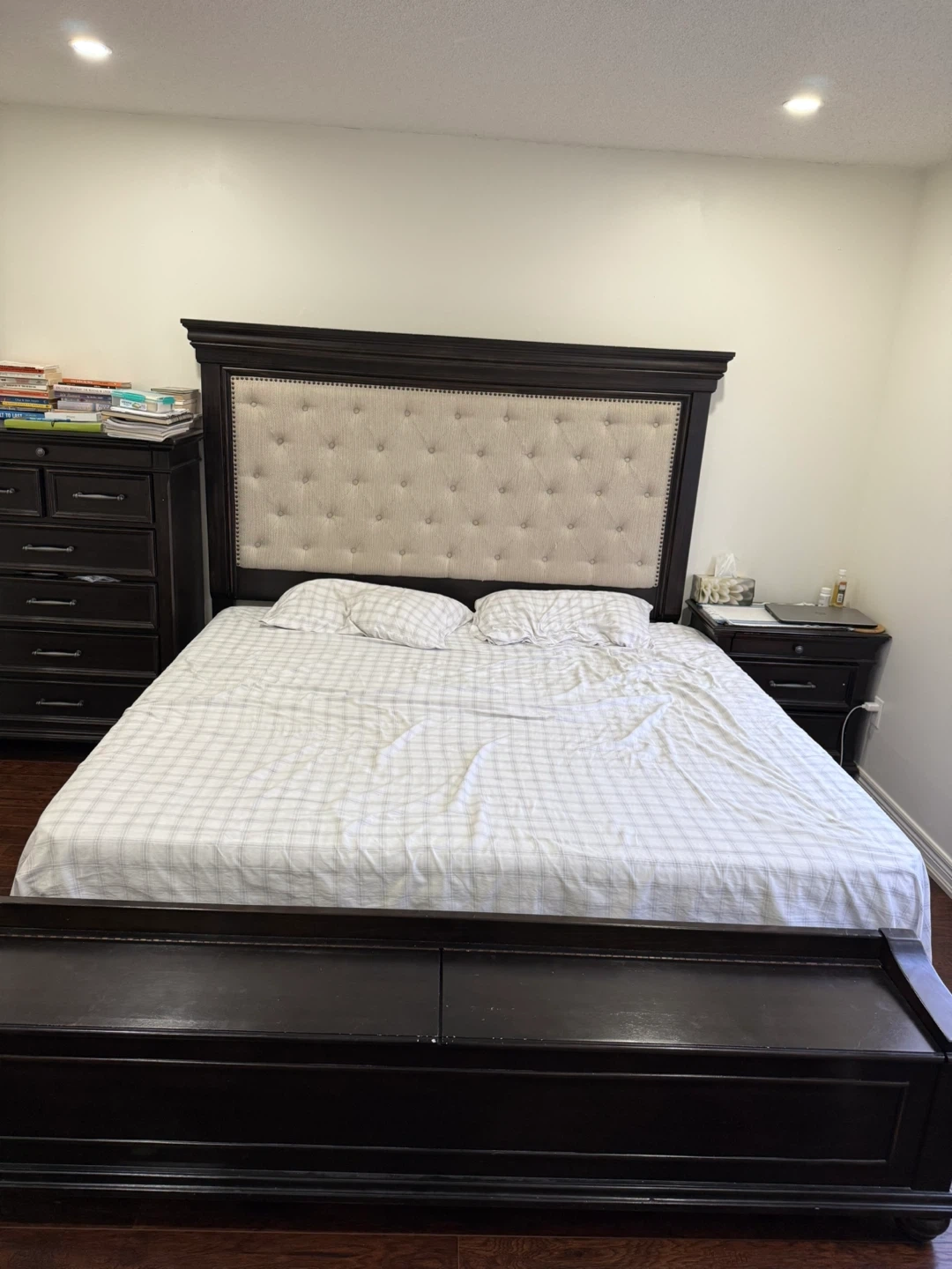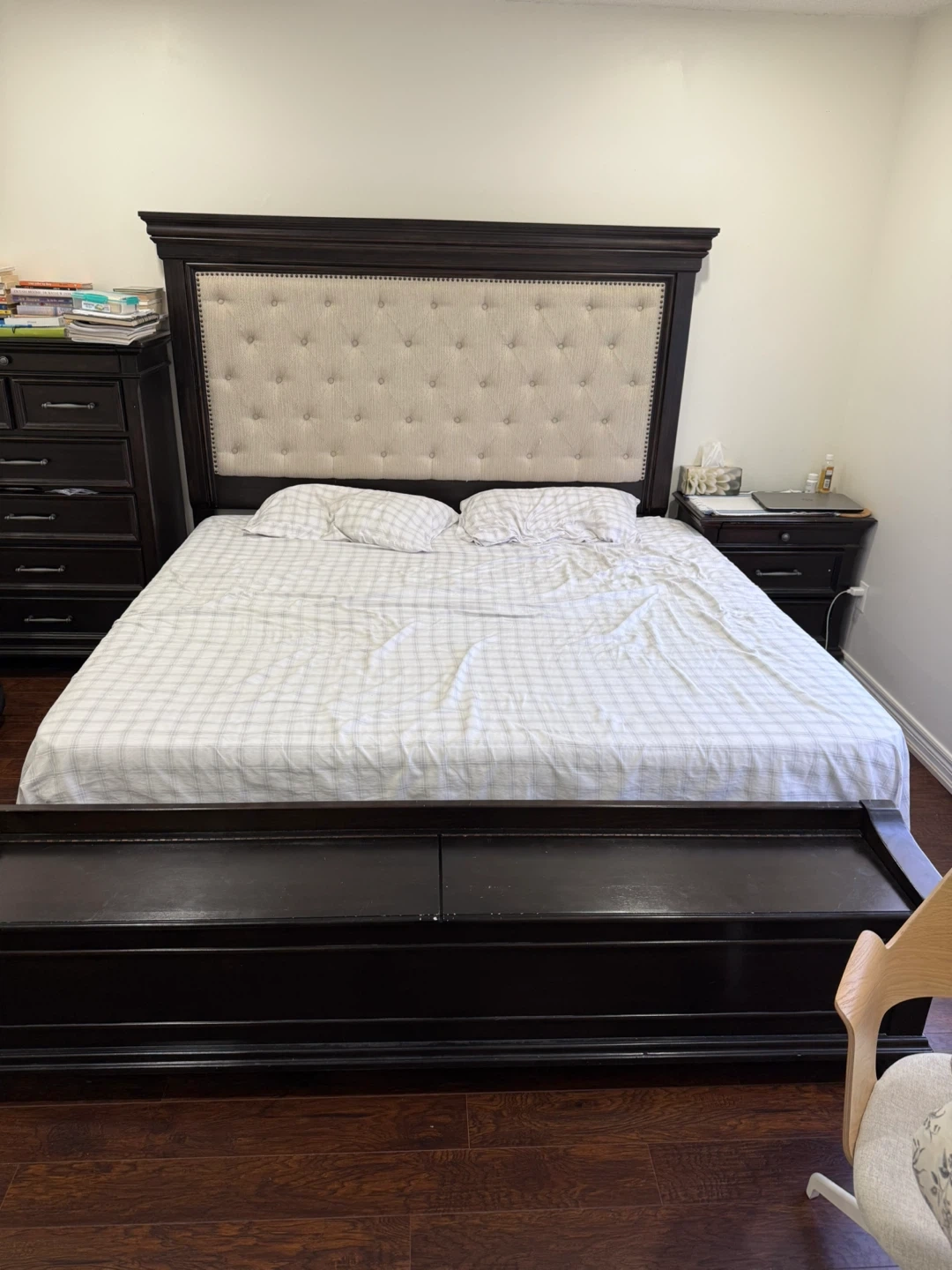 Selling a dark brown king size bedroom set. Includes a bed frame, nightstand, a dresser with a mirror, and a tall dresser with mattress The set is in good condition and would be a great addition to any bedroom. Bed has boxes can be used for lot of storage.