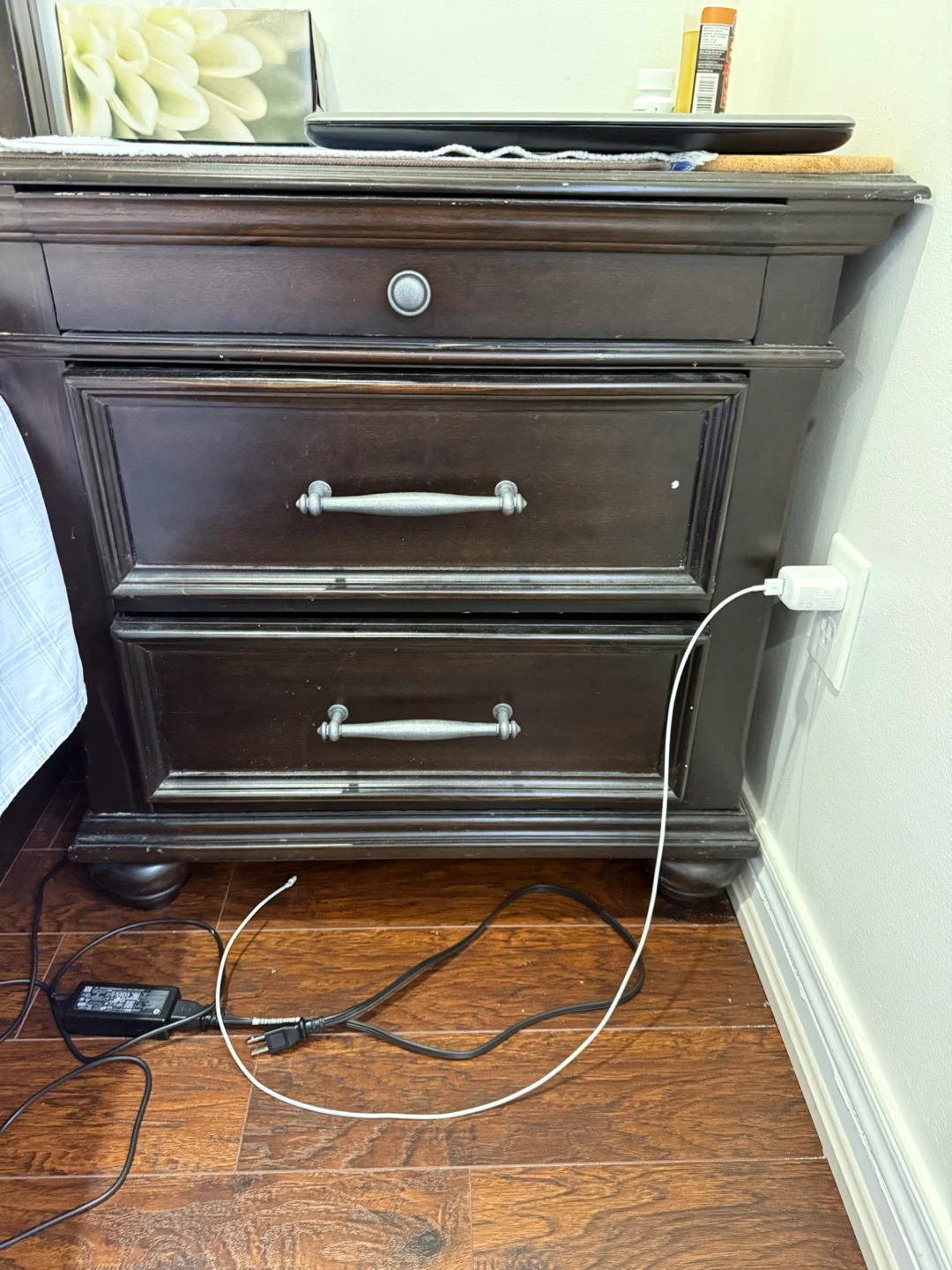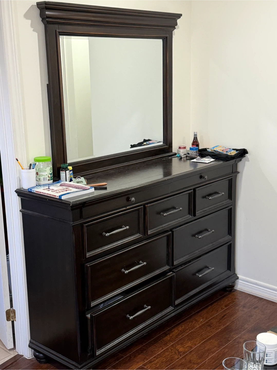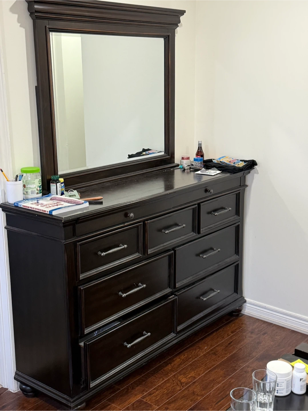 Selling a dark brown king size bedroom set. Includes a bed frame, nightstand, a dresser with a mirror, and a tall dresser with mattress The set is in good condition and would be a great addition to any bedroom. Bed has boxes can be used for lot of storage.