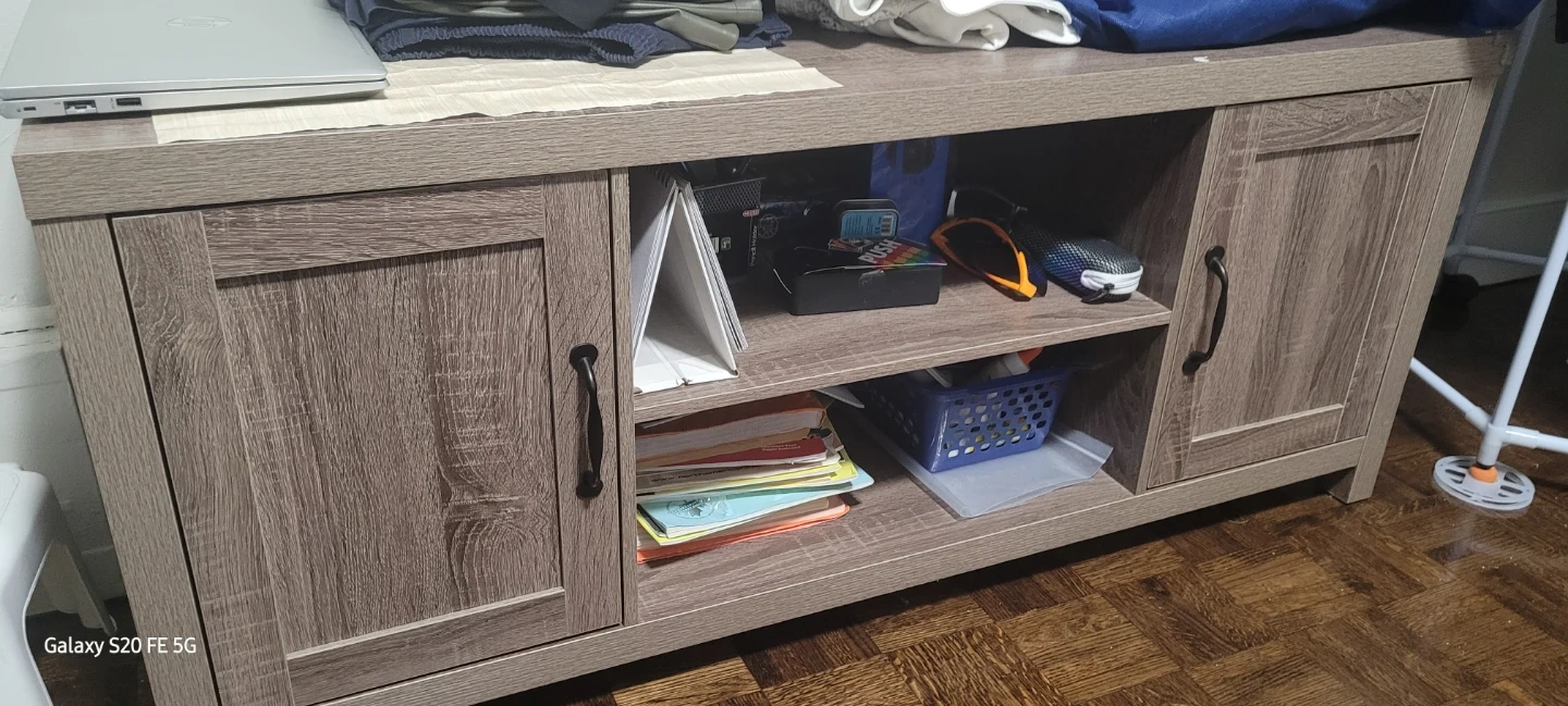 Selling a wood entertainment unit, perfect for your TV and media storage needs! It features two side cabinets with doors and an open shelf in the middle. It's In a very good condition and ready to find a new home