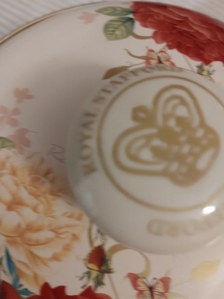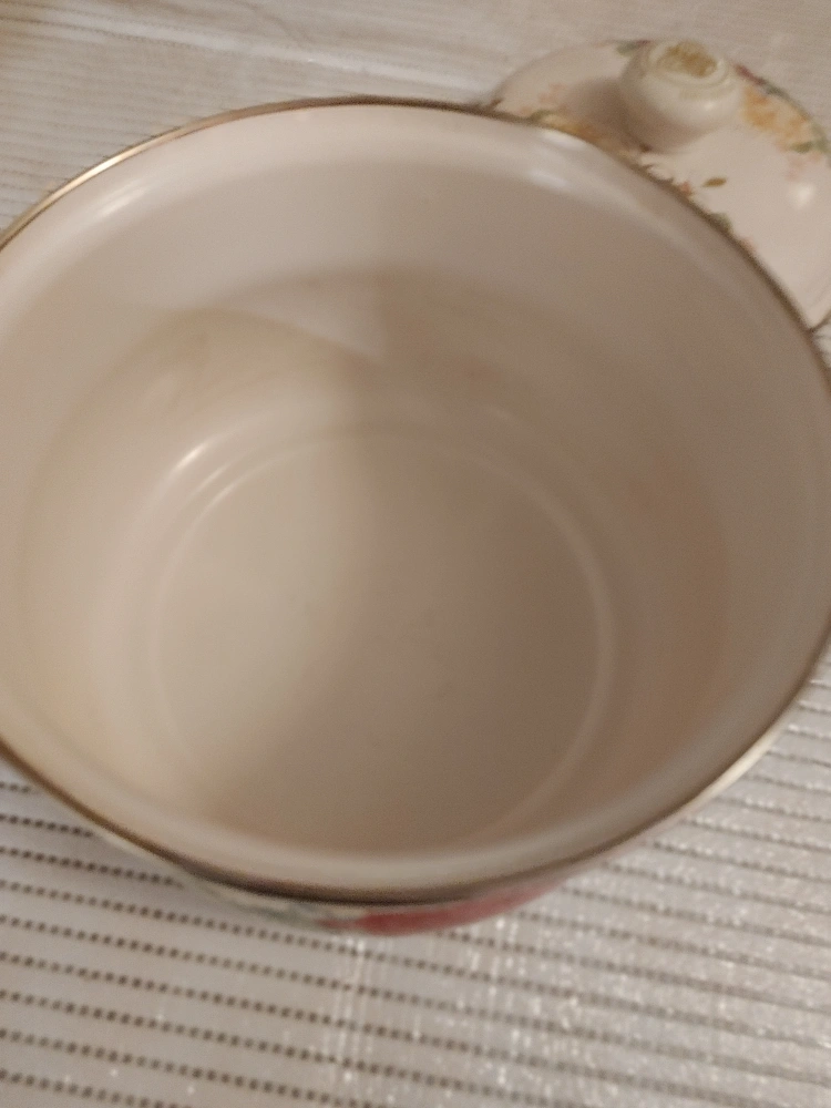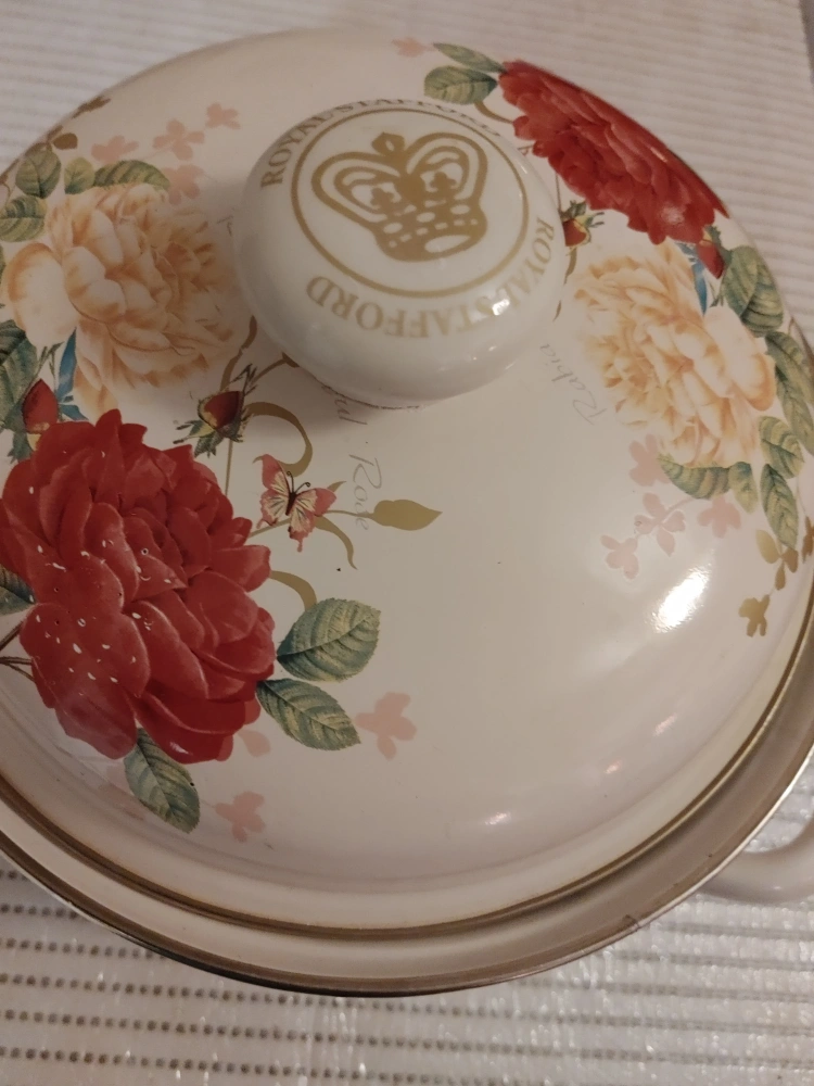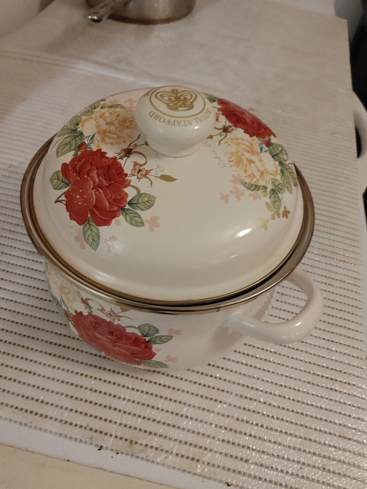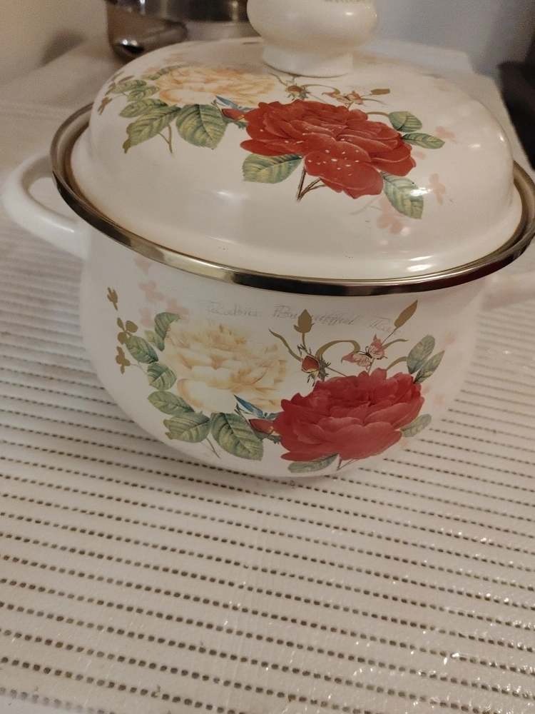 Selling a Royal Stafford enamel pot with a lid. It has a beautiful floral design with red and cream roses. Perfect for cooking or serving!