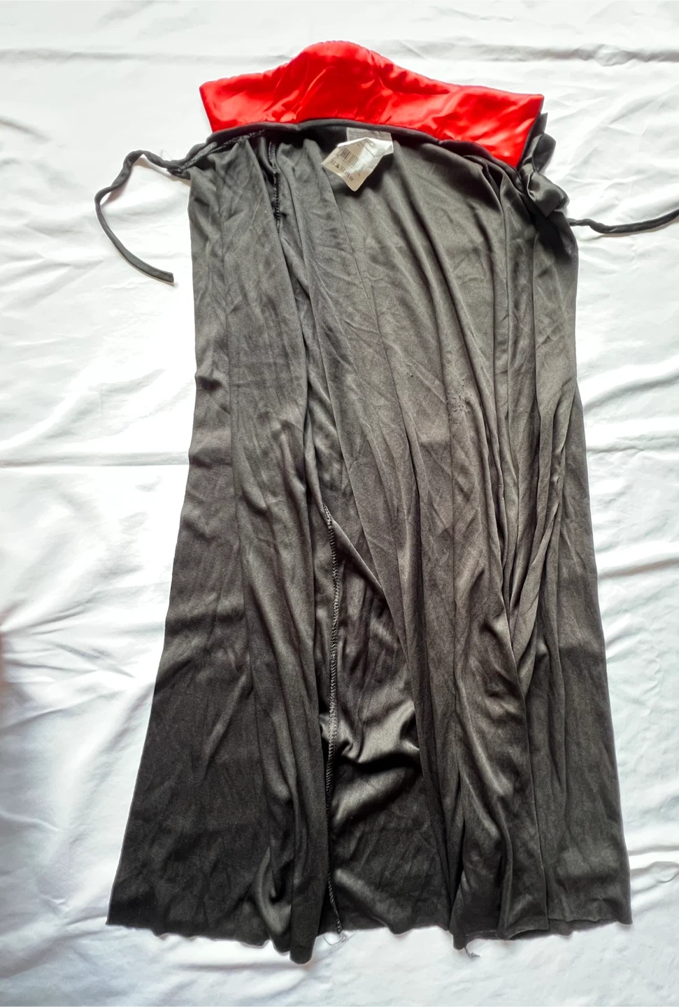 Get ready for Halloween with this vampire costume! It features a black cape with a red collar. Perfect for parties or trick-or-treating