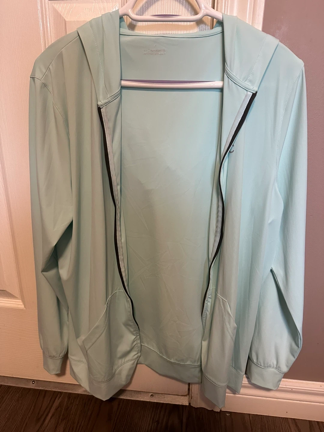 Selling a light blue zip-up hoodie from Athleta! It's in great condition and perfect for layering. It features a hood and pockets, making it both stylish and functional