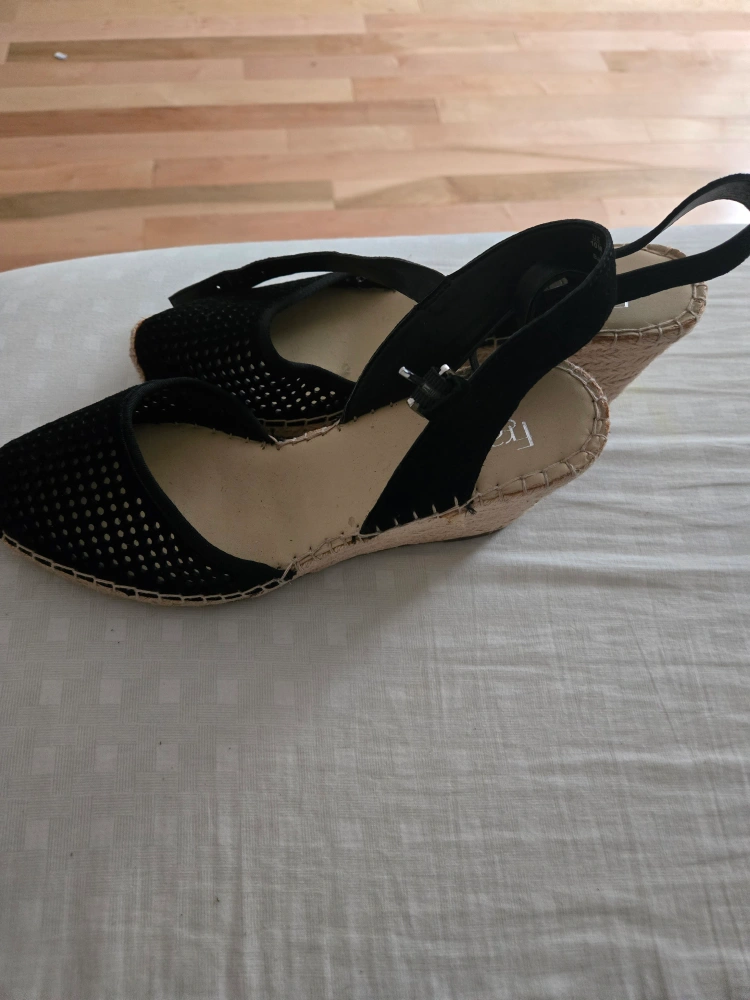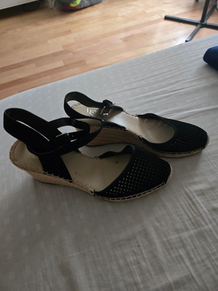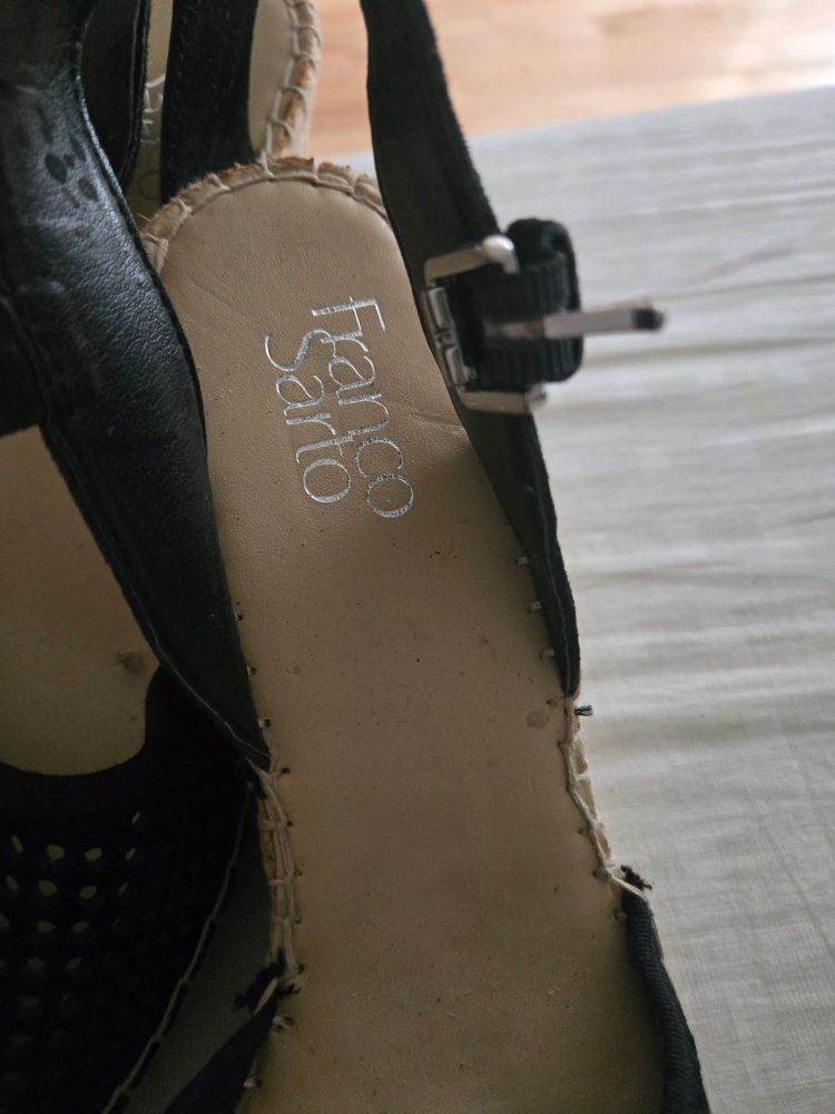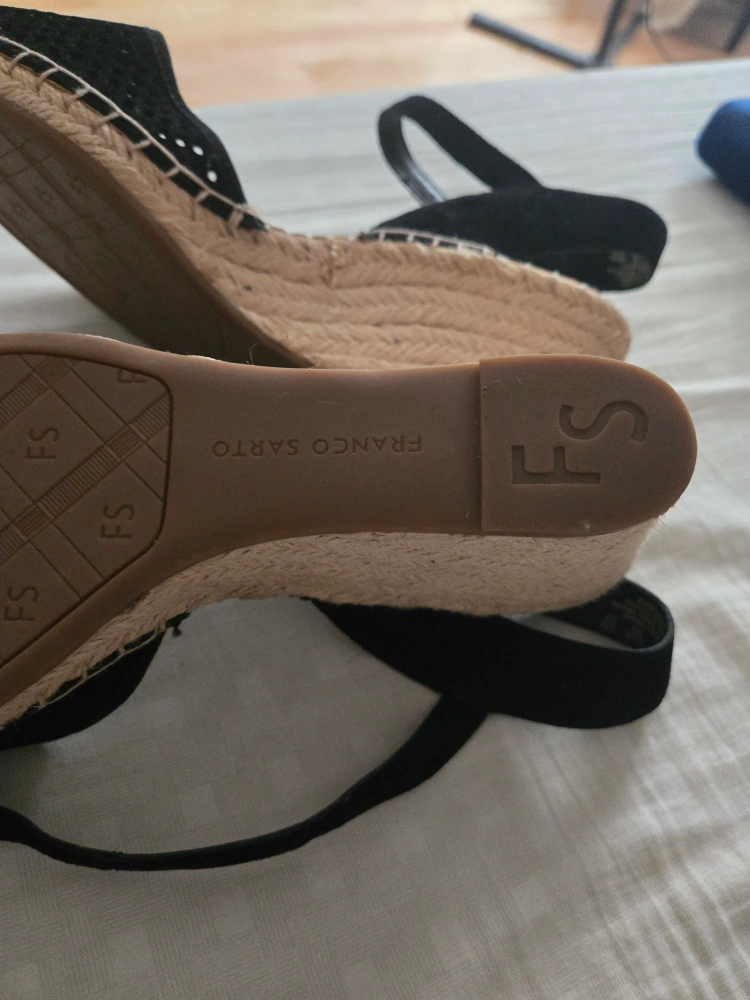 56These are a pair of Franco Sarto espadrille wedge sandals in a size 9. They feature a black upper with an ankle strap and a wedge heel. The material is a combination of suede and woven straw-like material. They are brand new