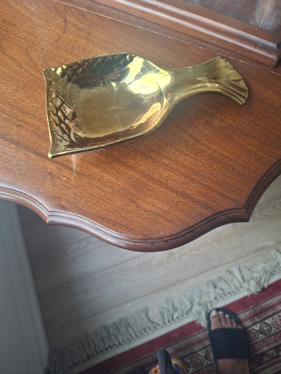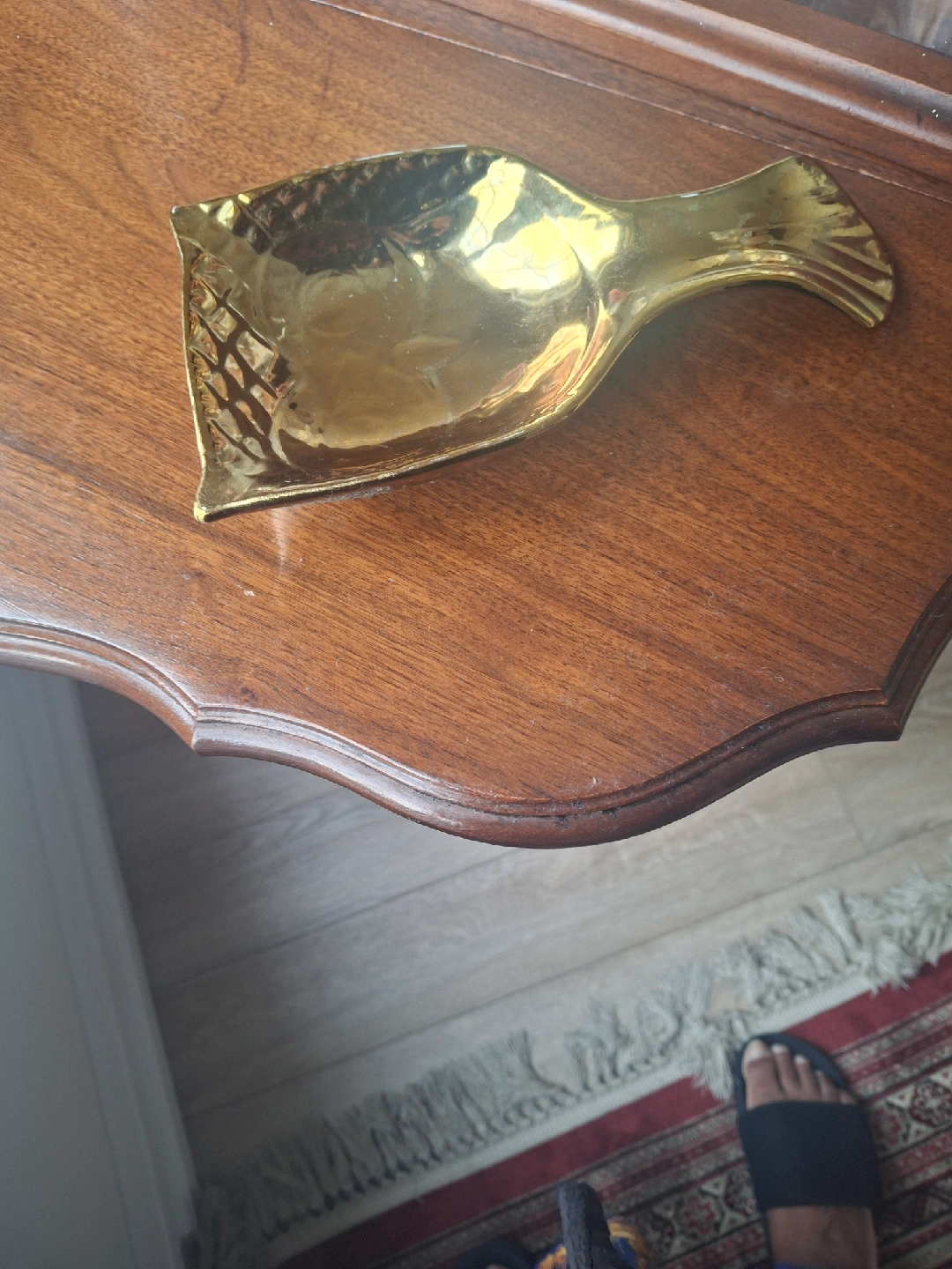 Selling a vintage brass trinket dish. It has a unique shape and a lovely golden colour. Perfect for holding small items or as a decorative piece!