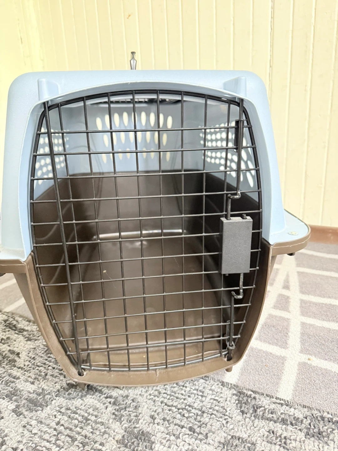 151Selling a Petmate Sky Kennel pet carrier in great condition! It's a sturdy and reliable carrier, perfect for travelling or vet visits. It features a durable plastic shell with metal wire door. The carrier is light blue and brown.