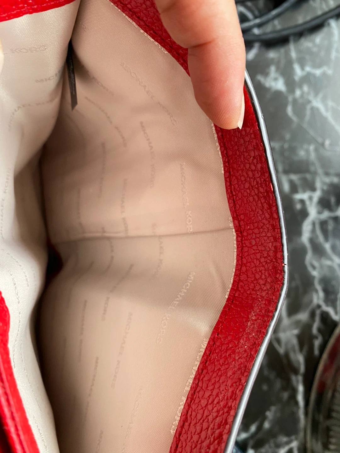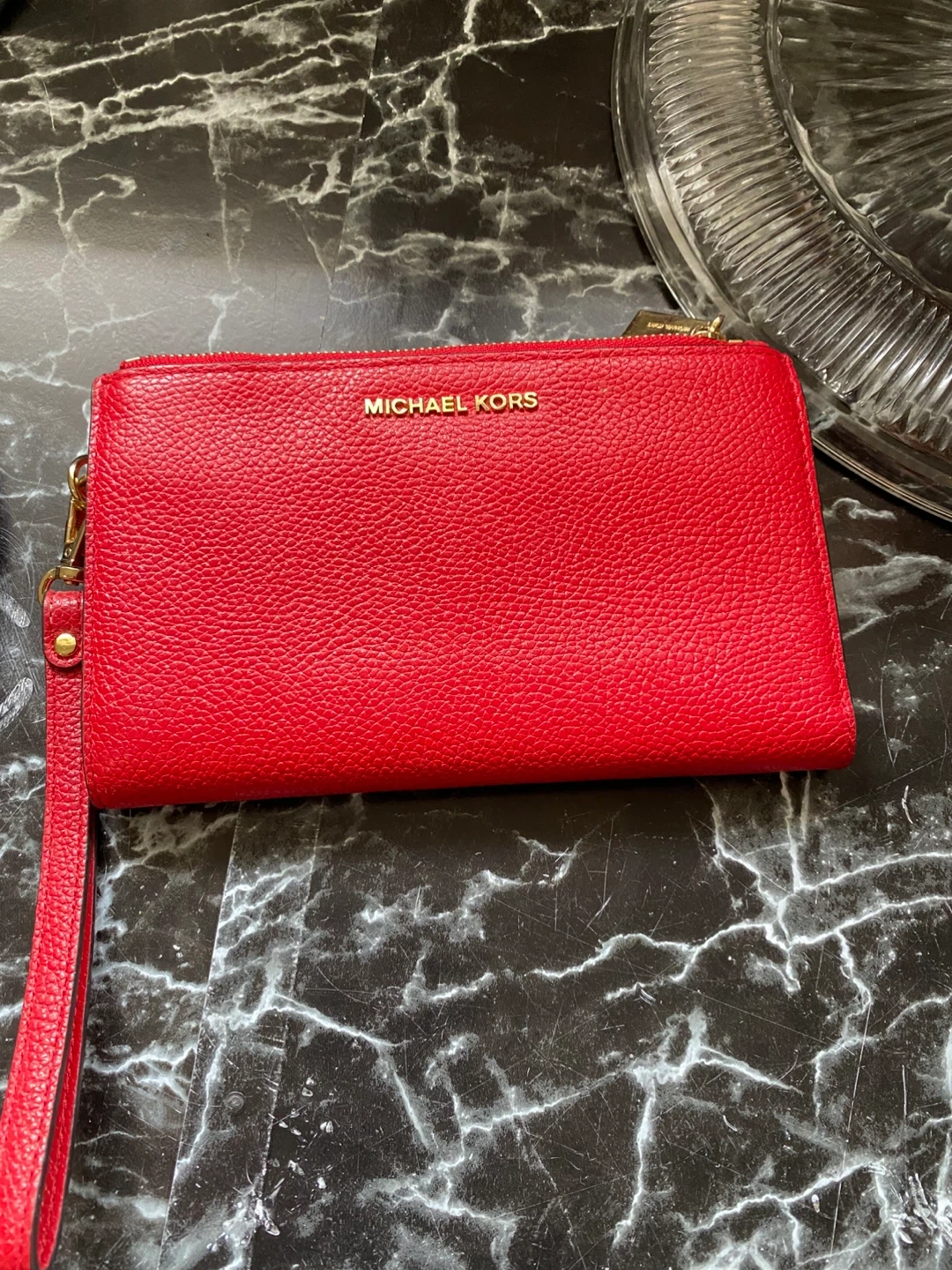 Selling a gently used Michael Kors wallet in red leather. It has a wrist strap and gold zippers. Lots of card slots and compartments inside