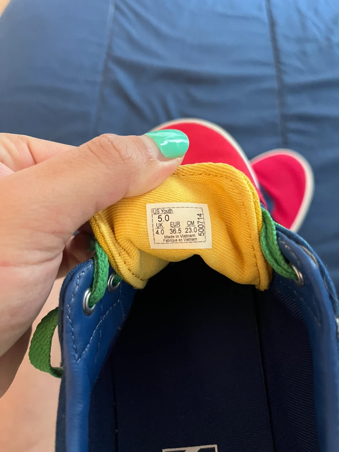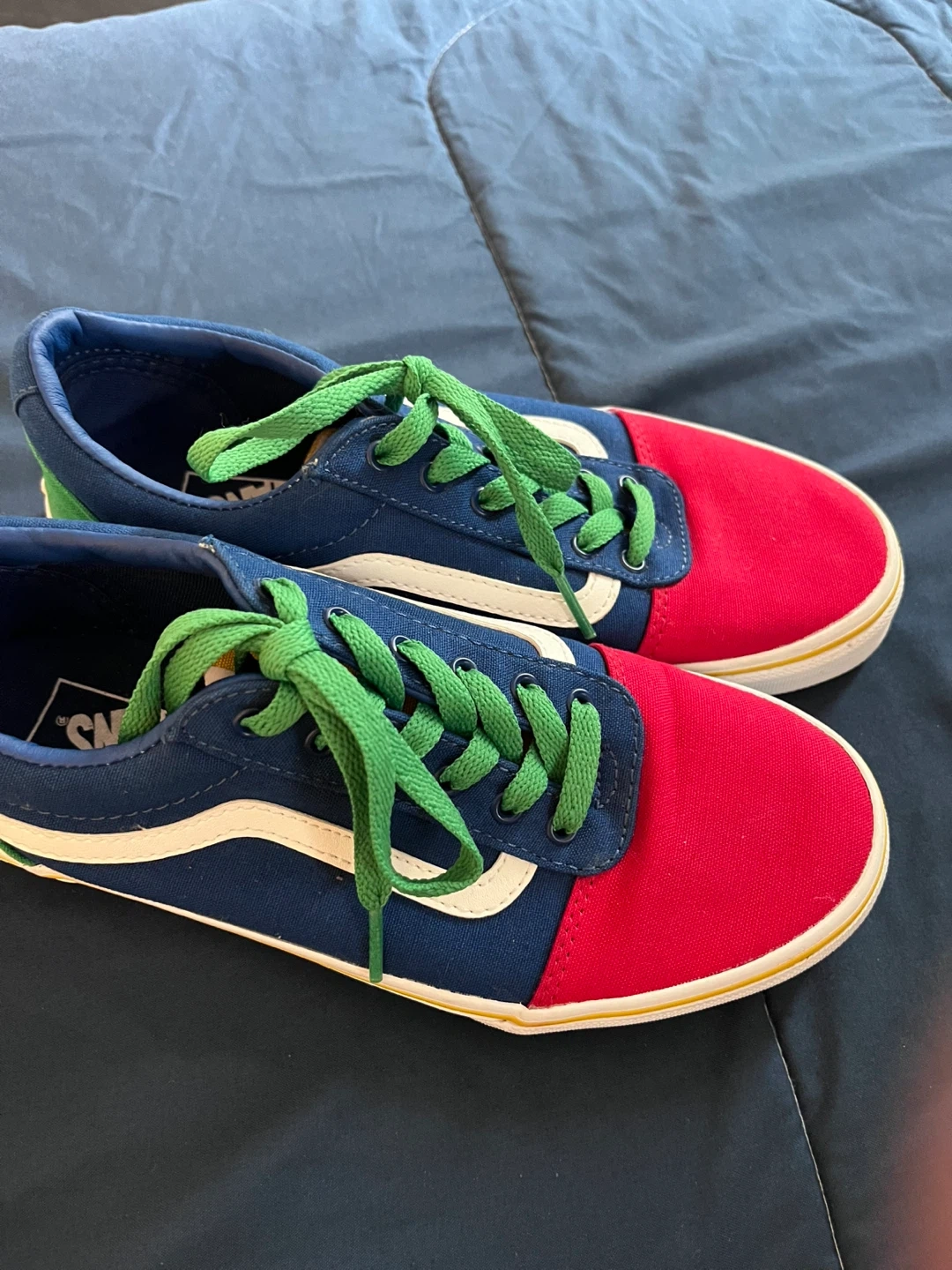 Selling a pair of Vans youth size 5 sneakers in a fun colour block design! These are in great condition and would be perfect for everyday wear. The vibrant colours make them a stylish choice!
