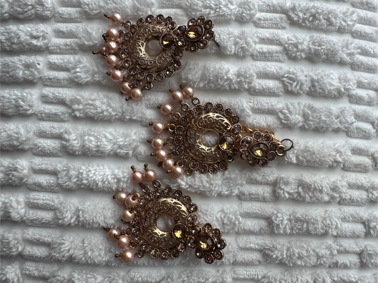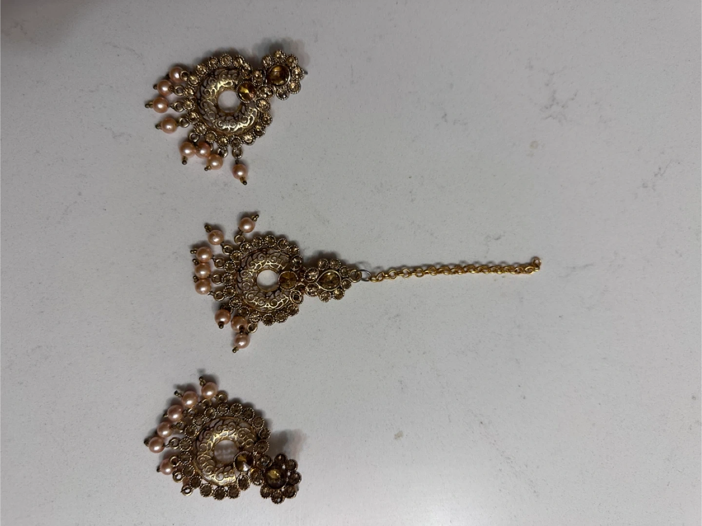 This is a beautiful set of gold-tone jhumka earrings and a matching tikka. It's adorned with delicate pink pearls and clear embellishments. The set is great for special occasions and cultural events!