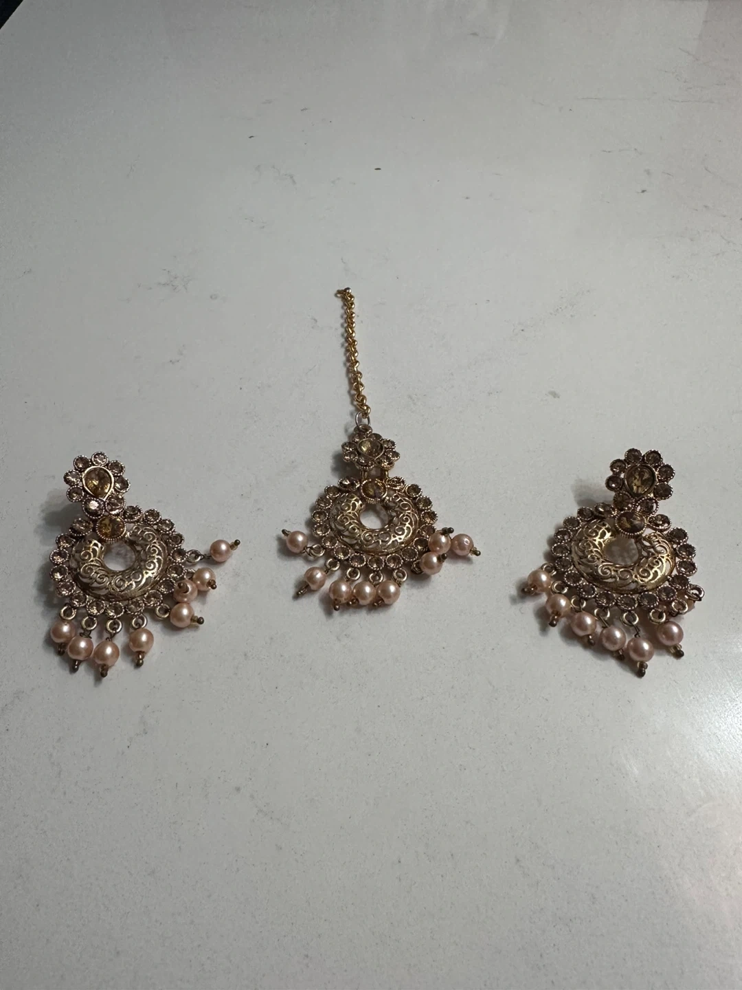 This is a beautiful set of gold-tone jhumka earrings and a matching tikka. It's adorned with delicate pink pearls and clear embellishments. The set is great for special occasions and cultural events!