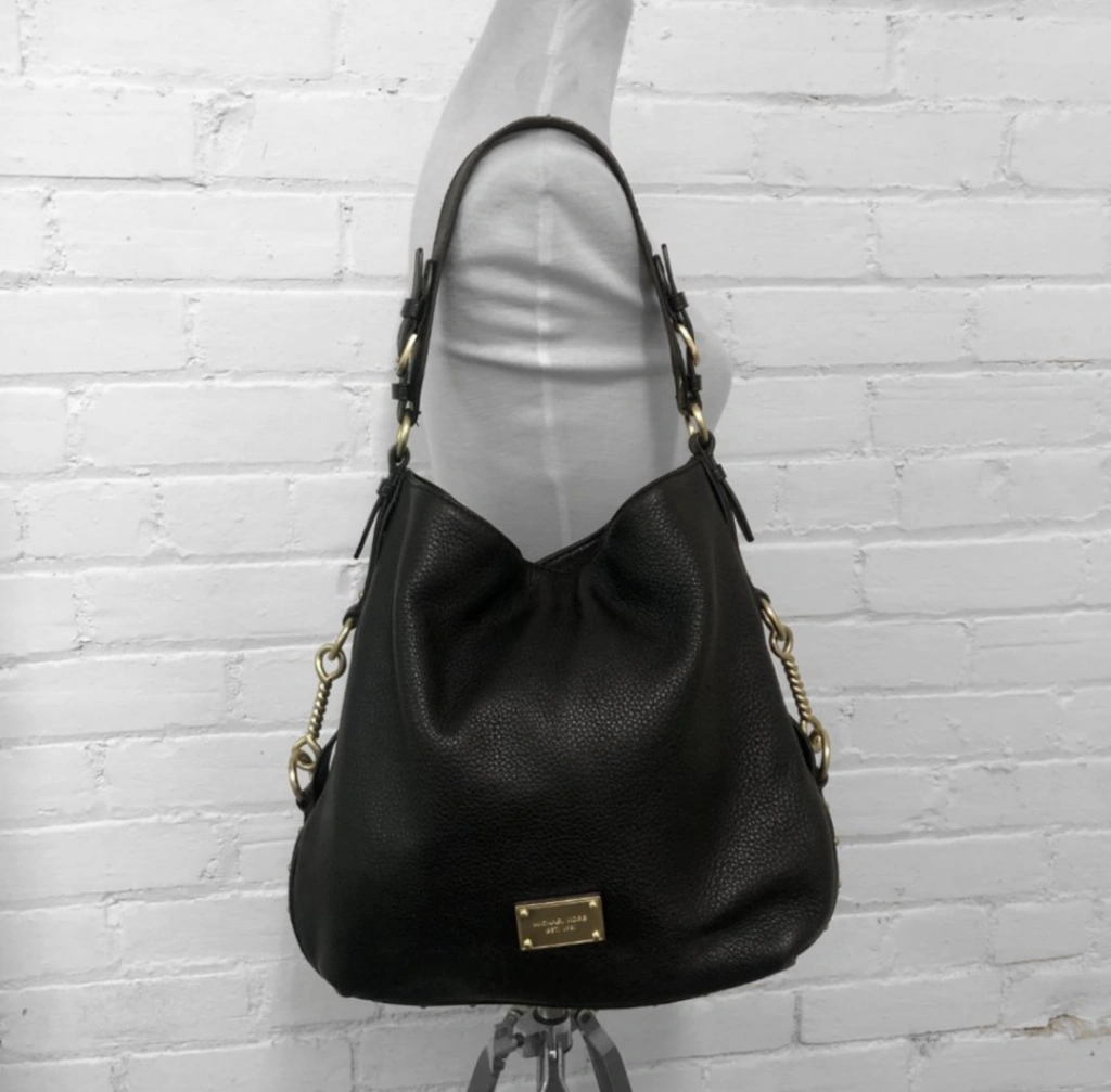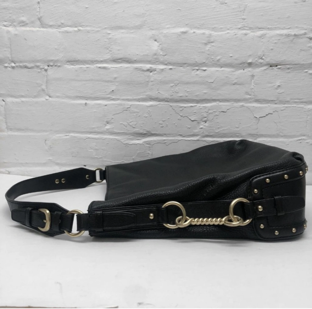 crafted from black leather and features gold-tone details. Held by a single handle, it has a capacious fabric interior that can easily hold your essentials. Length: 33 cm x Width :9.5 cm x Height: 33 cm x Handle Drop: 17 cm. Hardware: Gold Tone Exterior Material : Leather Interior Material: Fabric