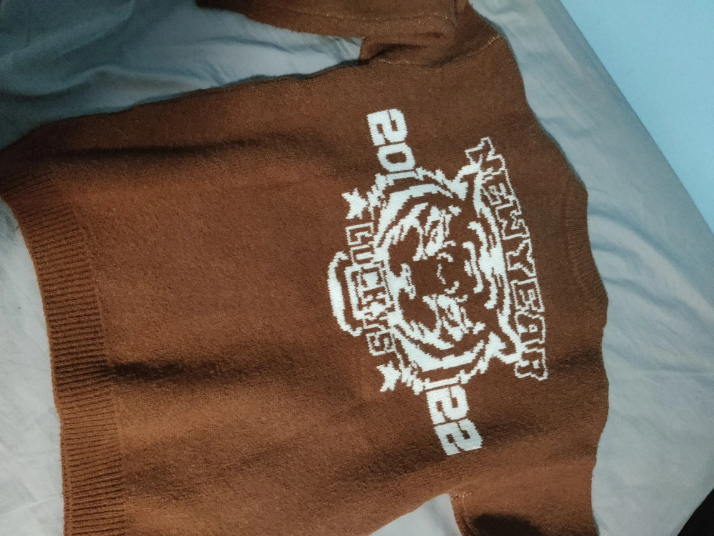 104Cozy brown sweater with white letteringon the front and a tiger design on the back.