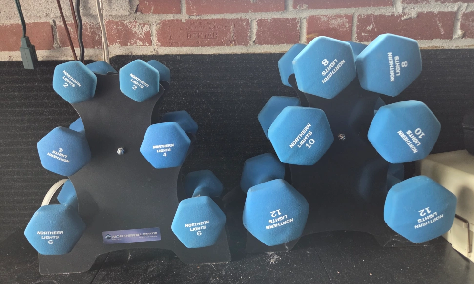 Selling a complete set of Northern Lights dumbbells with a rack! Weights range from 2 to 12 lbs, perfect for a variety of exercises. They're in great shape and ready for a new home gym