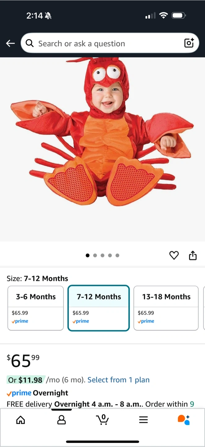 Super cute lobster costume, perfect for Halloween or dress-up! It's in perfect condition and comes with the headpiece, gloves, booties and body suit. Recommended for babies aged 9-12 months (80cm). Originally bought for $65.99.