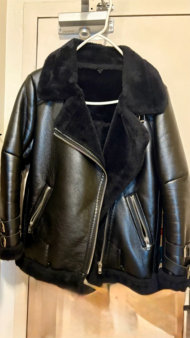 Selling a stylish black aviator jacket! It features a faux fur lining and a classic design. Perfect for staying warm and looking cool during the colder months