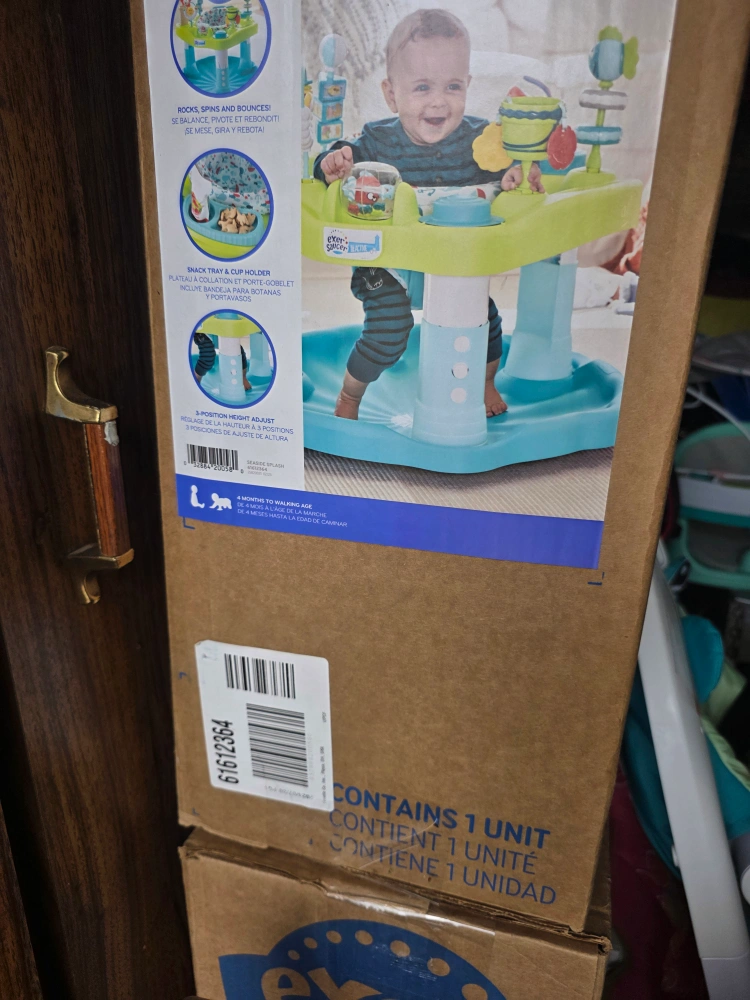 Evenflo ExerSaucer Seascape Splash Activity Center that rocks, spins, and bounces! It features a snack tray and cup holder, and 3-position height adjust. Recommended for babies 4 months to walking age. Contains one unit