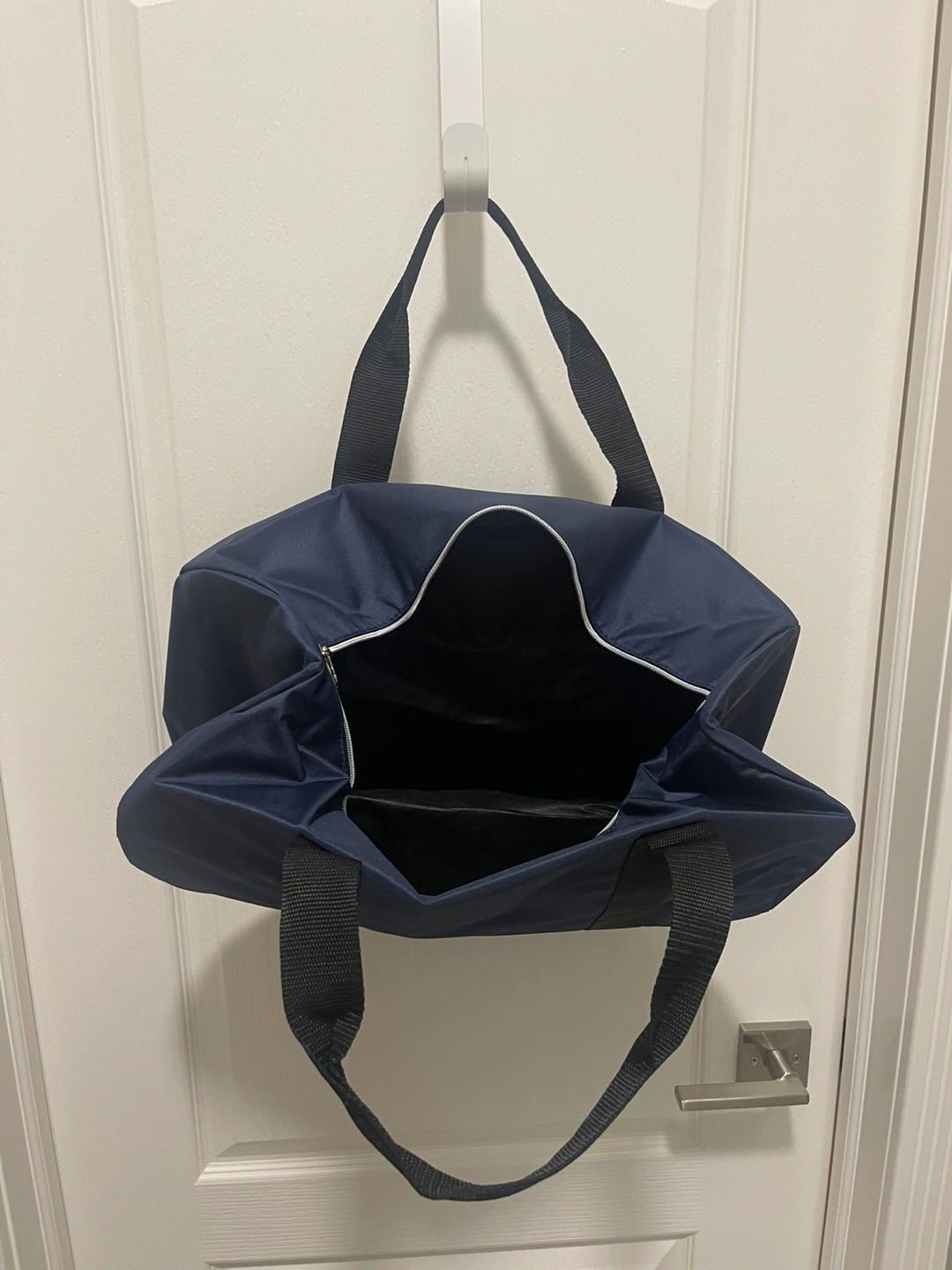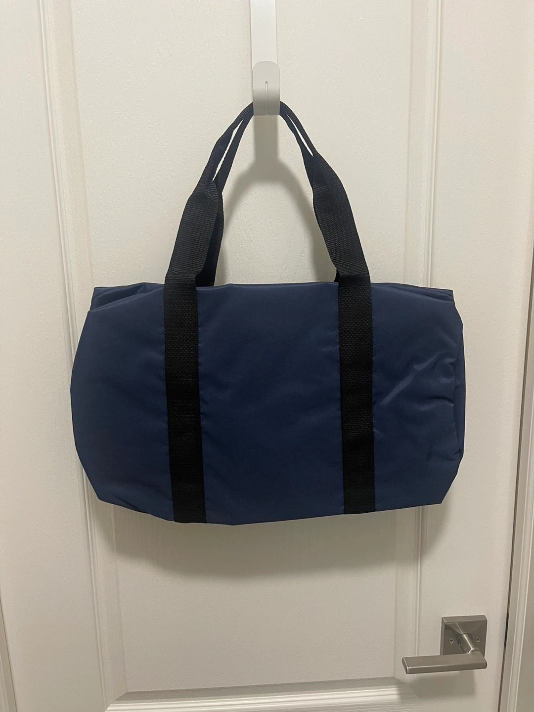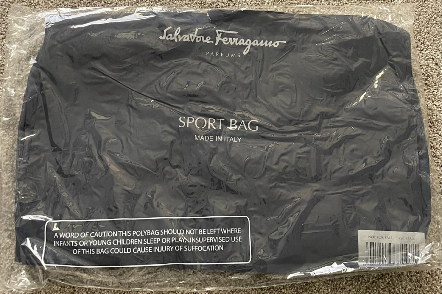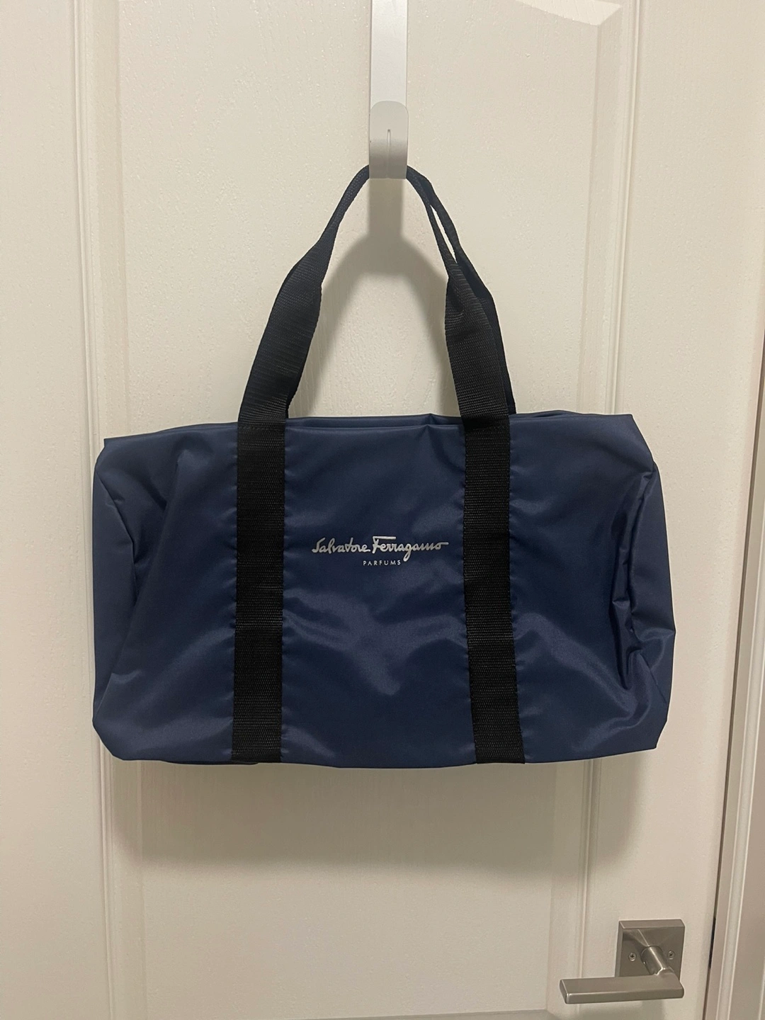 Here's a stylish Promotional Salvatore Ferragamo duffle bag in navy blue! MADE IN ITALY! It's perfect for travel or the gym. The bag features black straps and the Salvatore Ferragamo PARFUMS logo. It's unused and ready for a new home