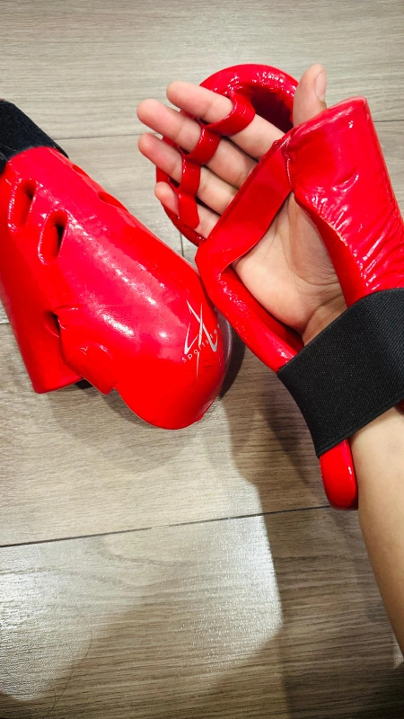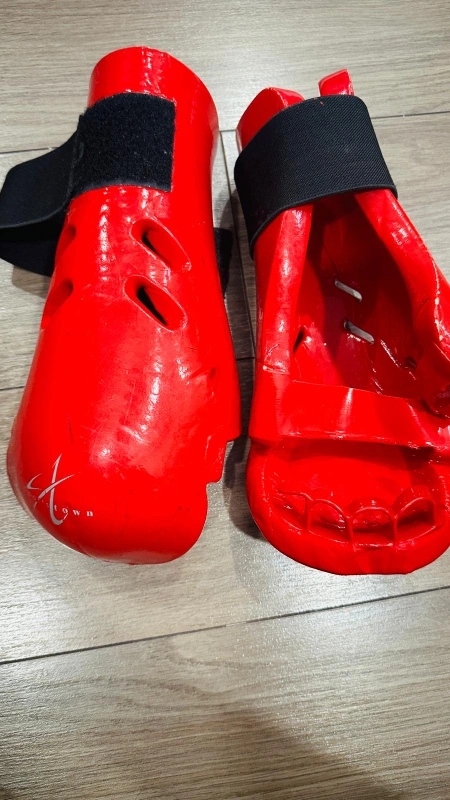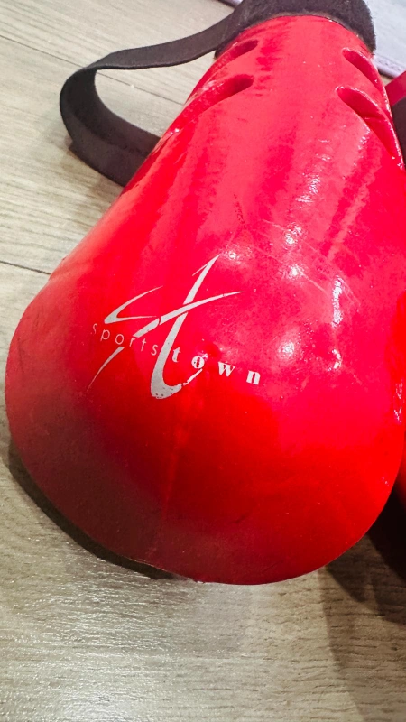 Selling a red Sports Town karate sparring gear set! Includes both the gloves and foot protectors. Great for training or competition. Comes in the original bag for easy storage and transport. Colors avaliable in b