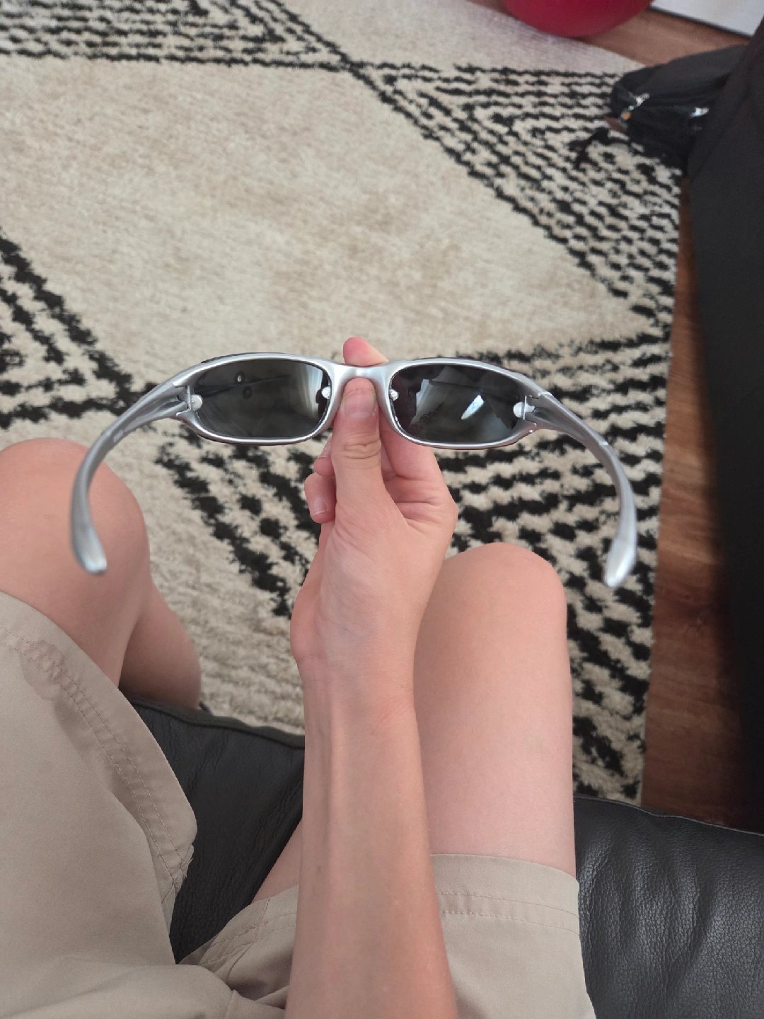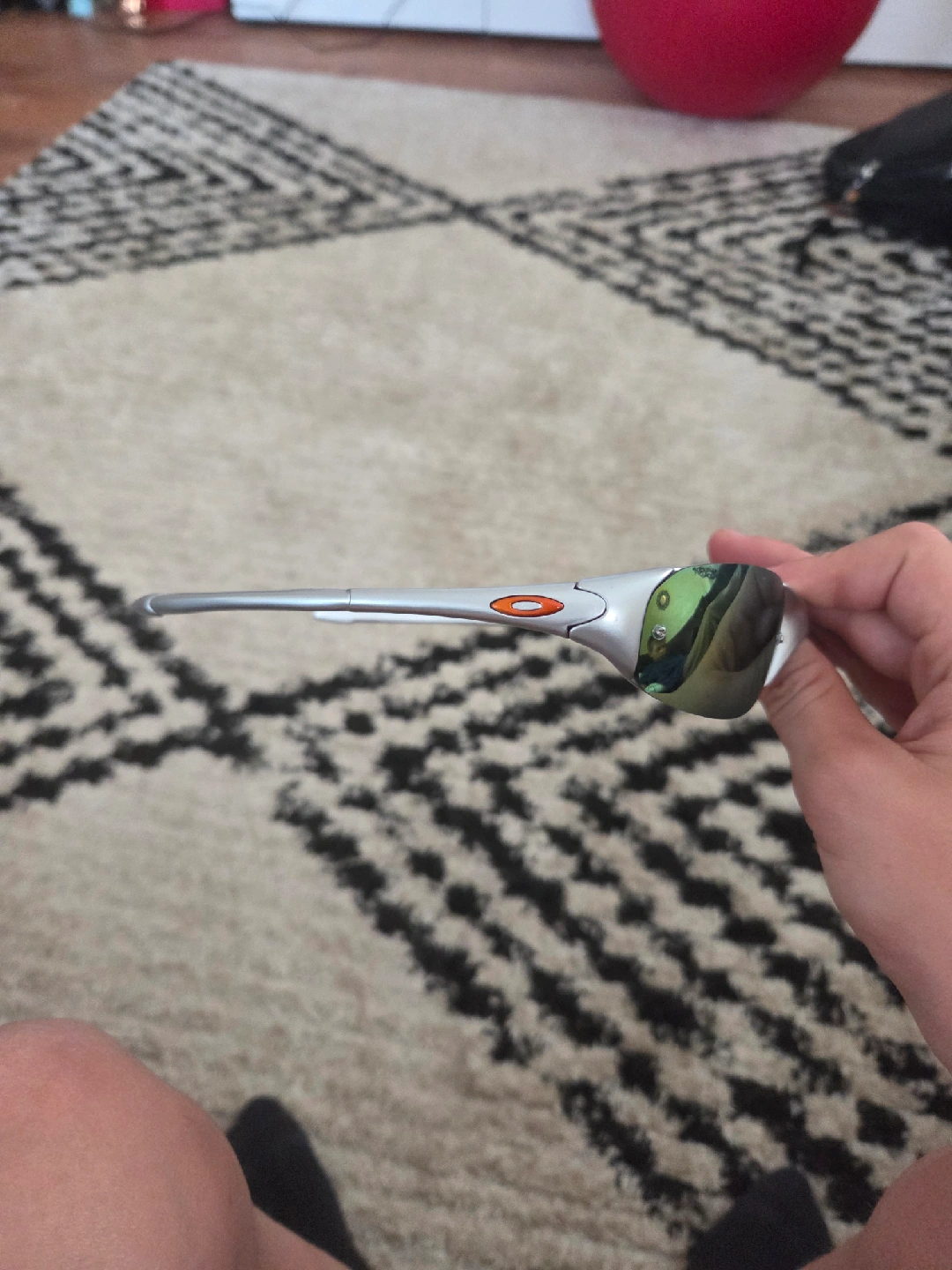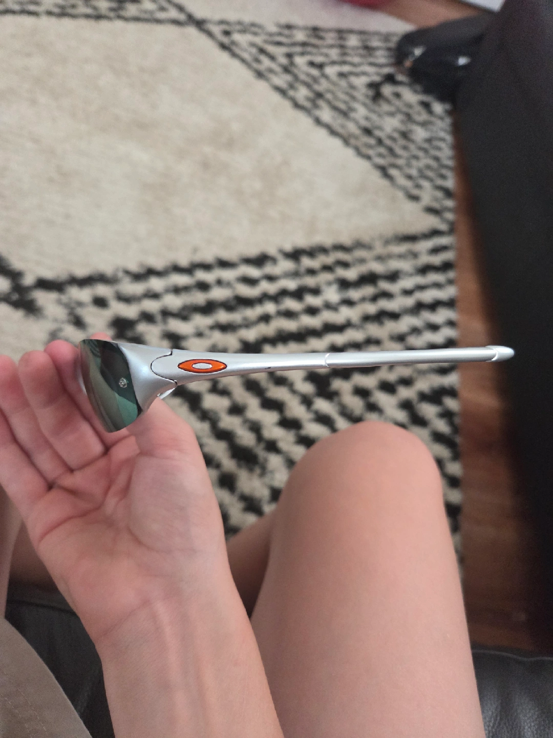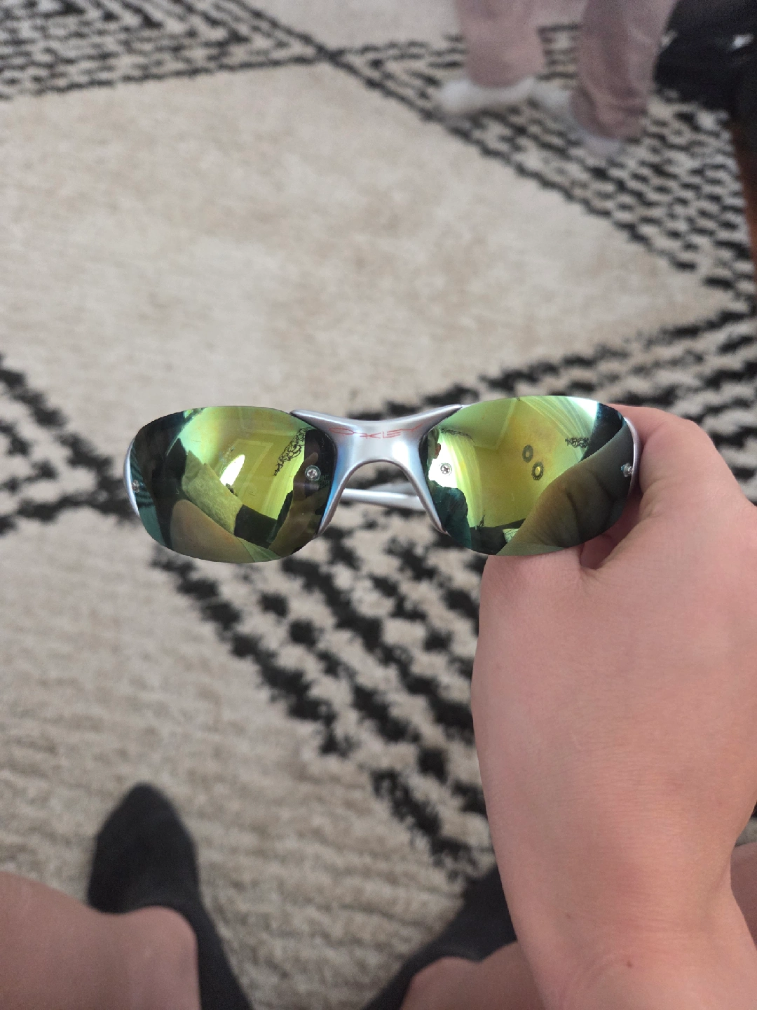 Oakley sunglasses with a silver frame and green lenses. Great condition!
