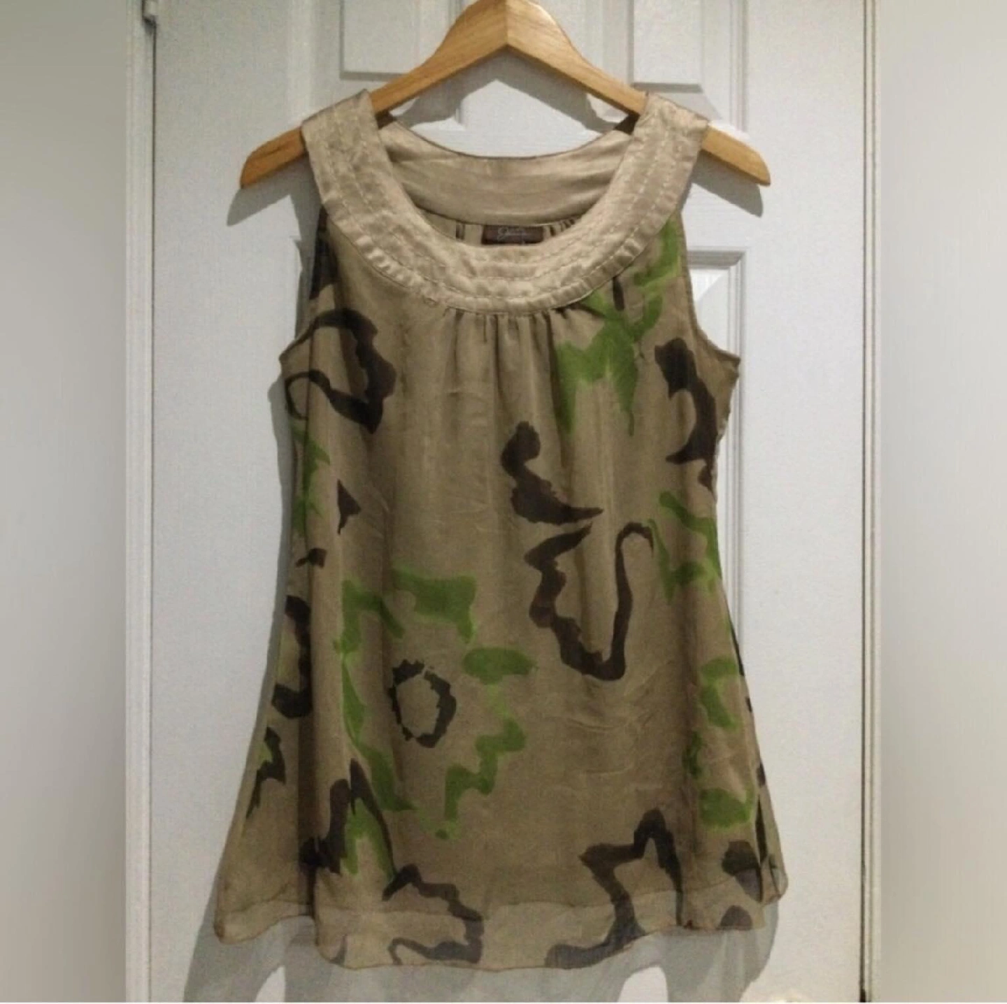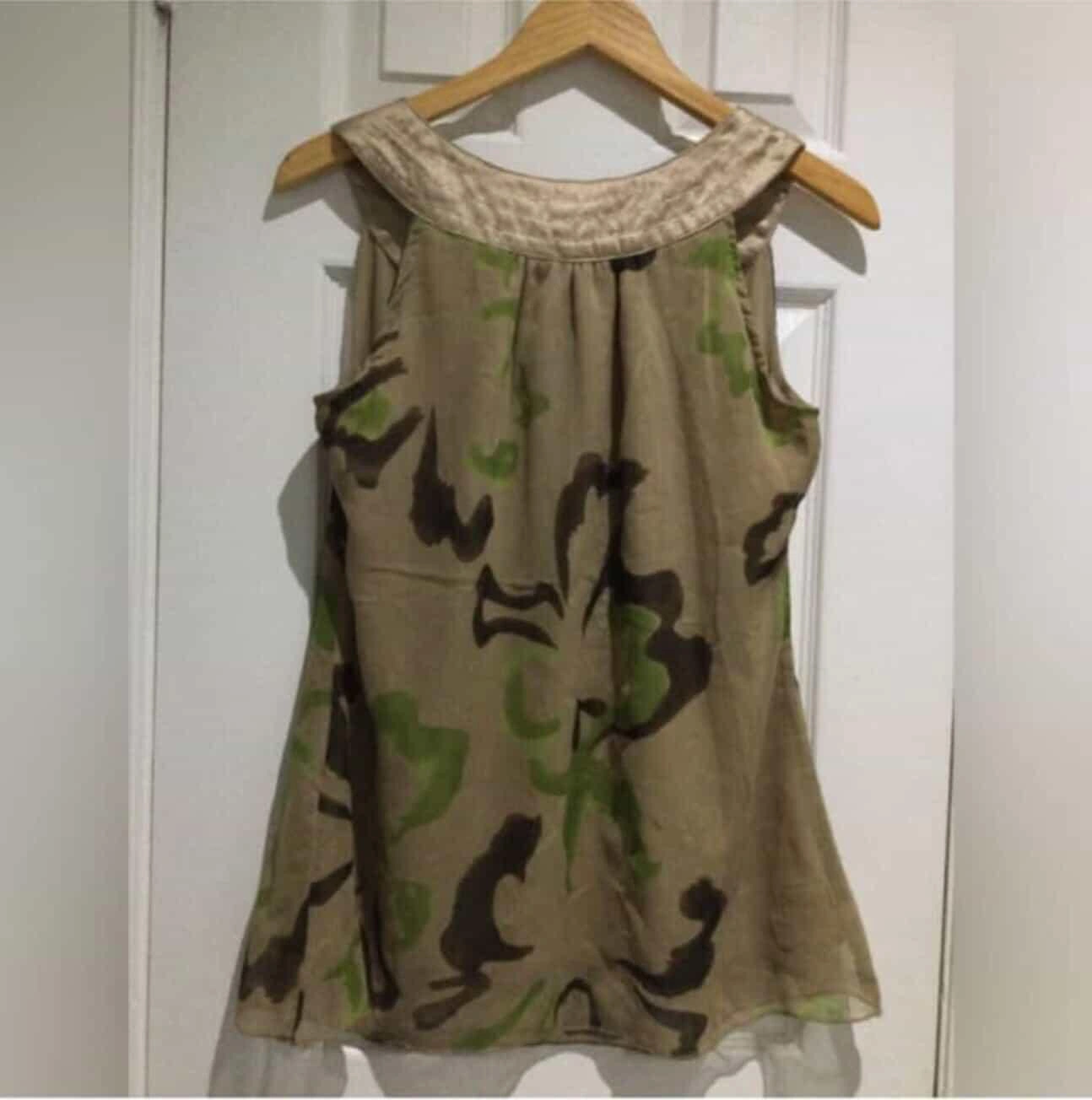 Selling a gently used Jessica tank top in size 6! It features a unique camouflage-like pattern with shades of green and brown. The material is lightweight and flowy, perfect for summer. It's in great condition and comes from a smoke-free home