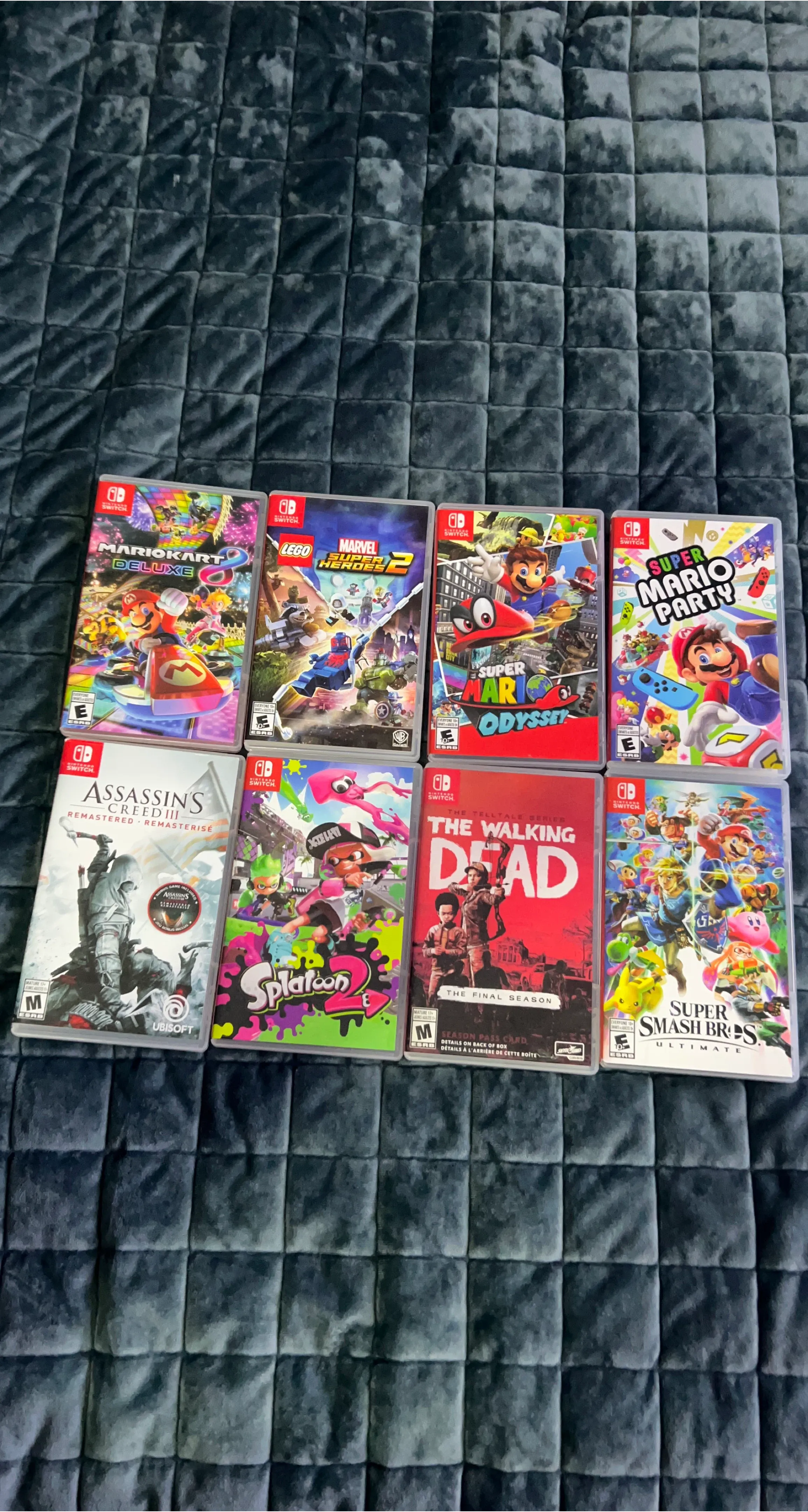 Bundle includes Mario Kart 8 Deluxe, Super Mario Odyssey, Super Mario Party, LEGO Marvel Super Heroes 2, Splatoon 2, Super Smash Bros. Ultimate, Assassin's Creed III Remastered, and The Walking Dead: The Final Season. All games are for the Nintendo Switch console.