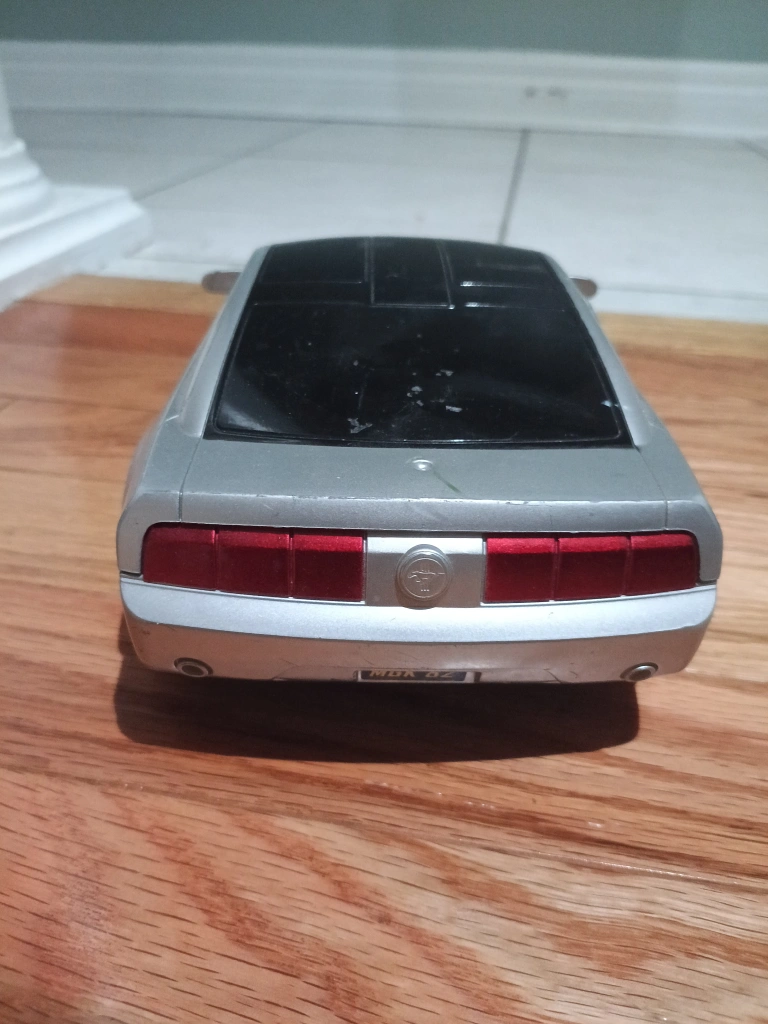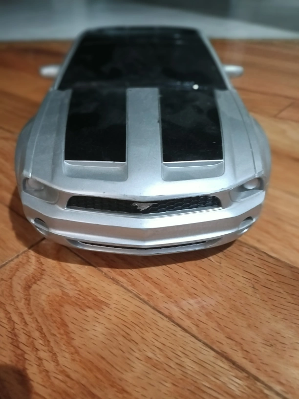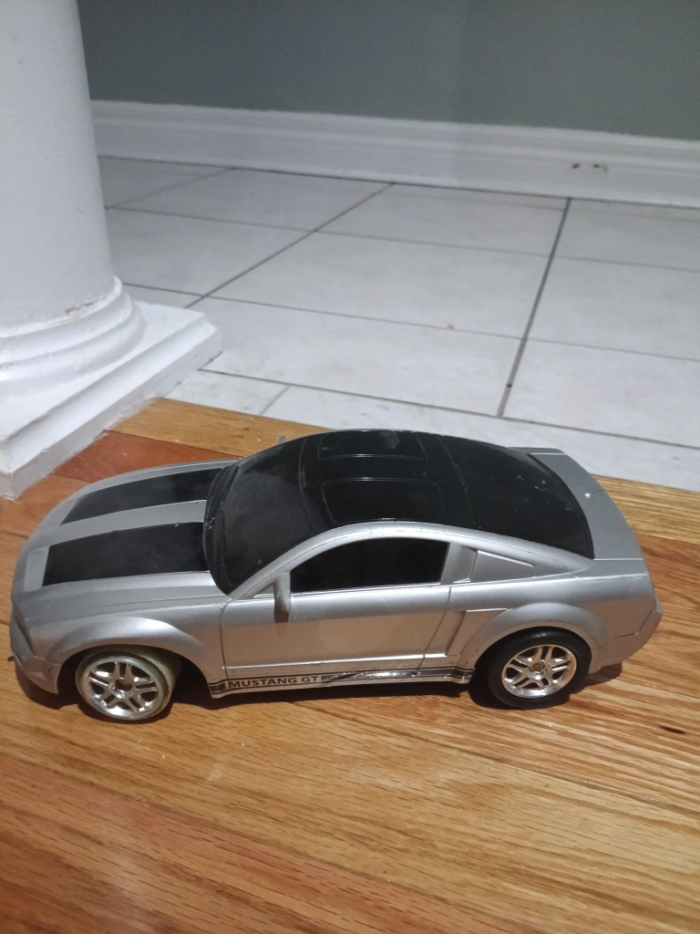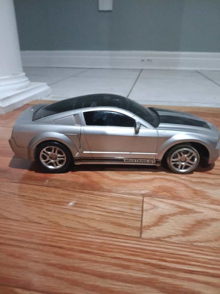 Selling a Ford Mustang GT toy car. It's silver with black stripes on the hood. A fun toy for kids!