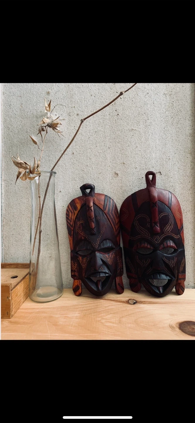 •Pair of African tribal masks in polished dark wood, featuring traditional facial carvings.