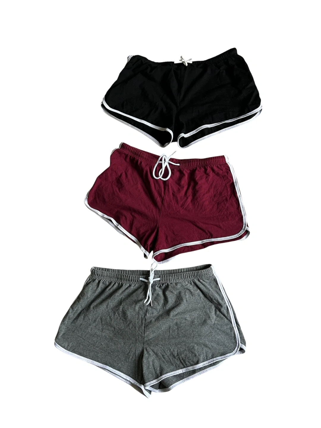 921Selling a set of three lounge shorts, perfect for relaxing at home or casual wear! The set includes one pair each in black, burgundy, and grey. They all have a comfortable fit and a drawstring waist. Great condition!